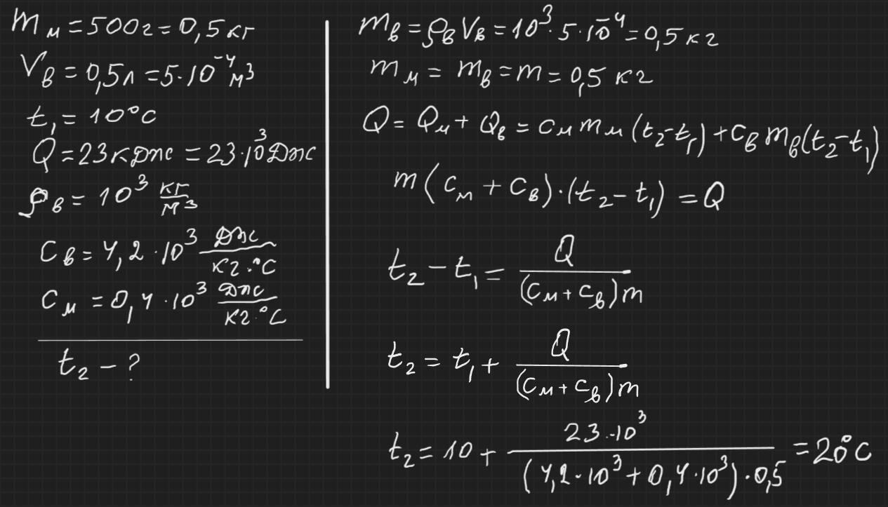 Мідний чайник масою 500 г містить 0,5 л води при температурі 10 С. Чайнику було надано кількість теплоти 23 кДж. До якої температури нагрілася вода? Теплові втрати не враховуйте. Питома теплоємність міді 400 Дж/(кг С).