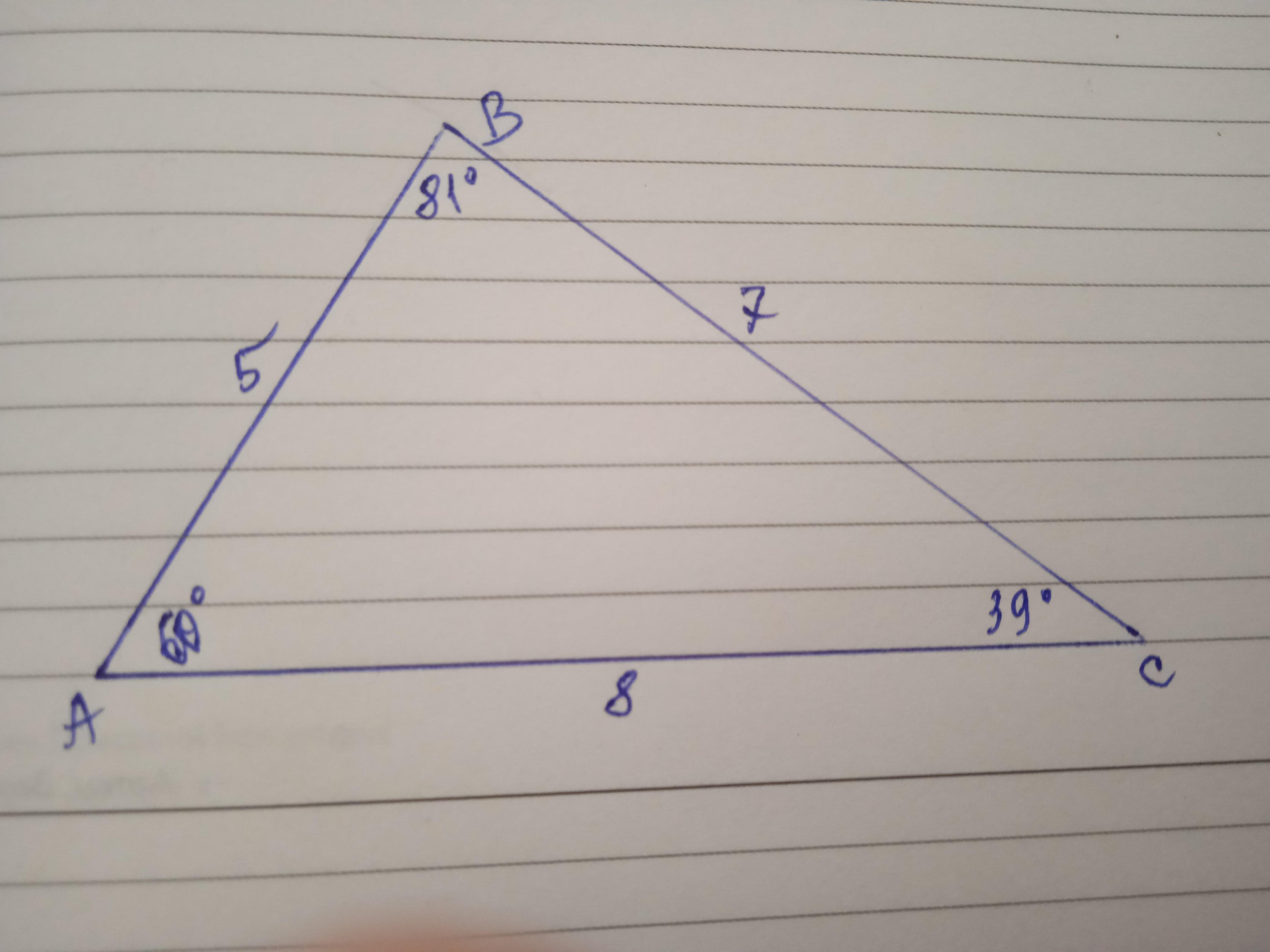 АВ²=АС²+ВС²-2*АС*ВС*соs39°=64+49-112*0,7771=113-87≈26