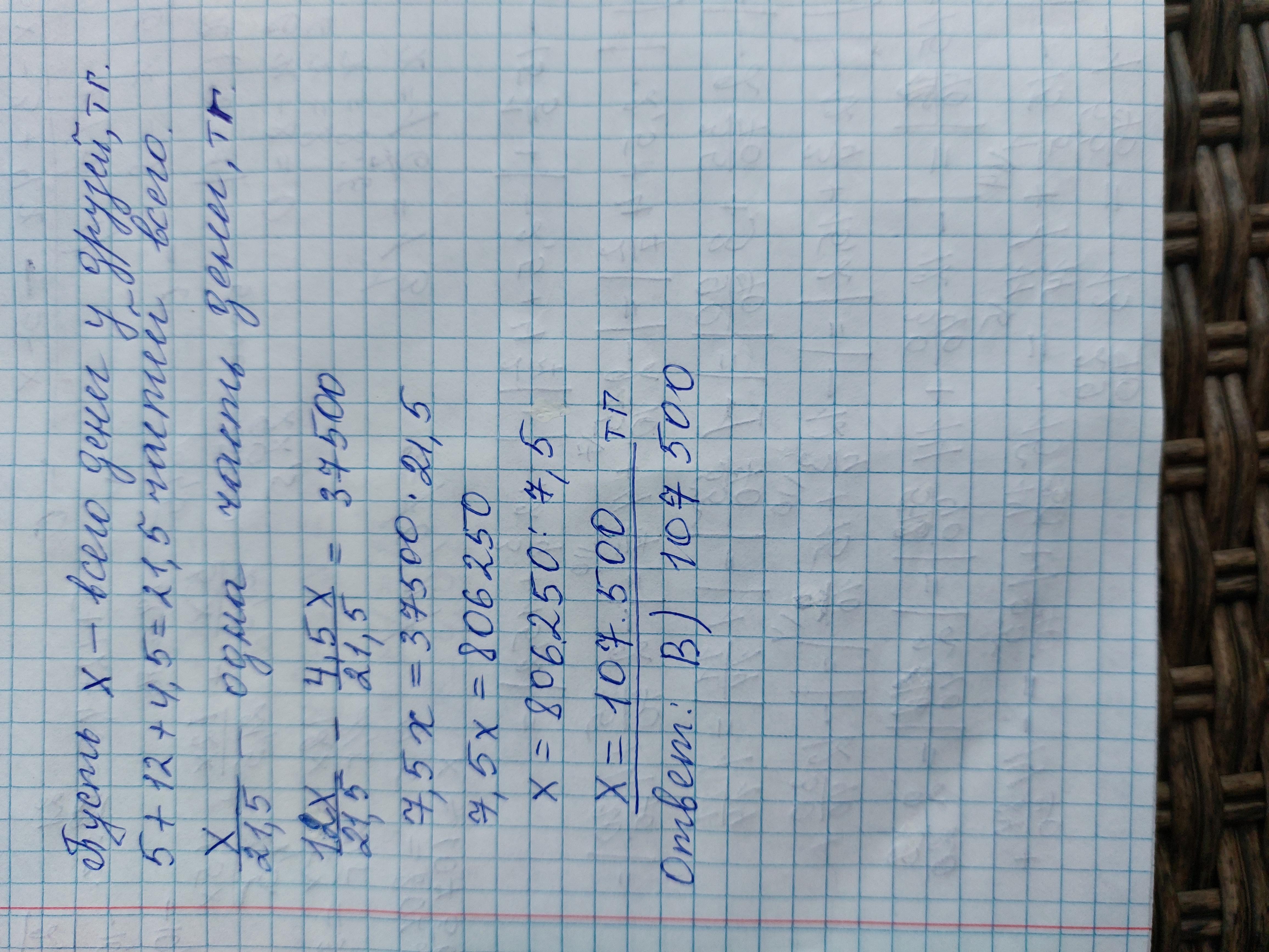 5. Три друга решили поехать вместе в путешествие по Казахстану. В течении двух месяцев они копили деньги. Когда перед путешествием друзья решили посчитать сколько денег удалось накопить каждому, то вышло, что отношение их накоплений равно отношению чисел 5; 12 и 4.5. Второй друг накопил на 37500 тг больше, чем третий. Сколько всего есть денег у друзей на A) 112000 IT путешествие? B) 107500 тг C) 92500 тг D) 78250 тг E) 99500 тг