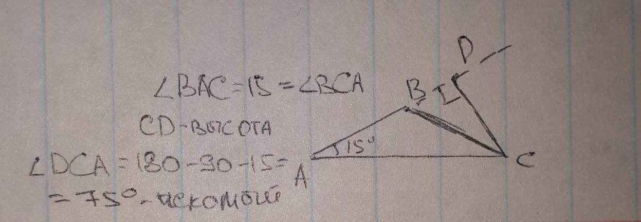 угол при основании равнобедренного треугольника равен 15 градусов на боковую сторону опущена высота Найдите угол между высотой и основанием