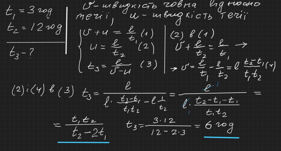 моторный човен проходить відстань між двома пунктами А і В за течією річки 3 год,а поіт -за 12 год. Скільки часу моторний човен затратить на зворотний шлях