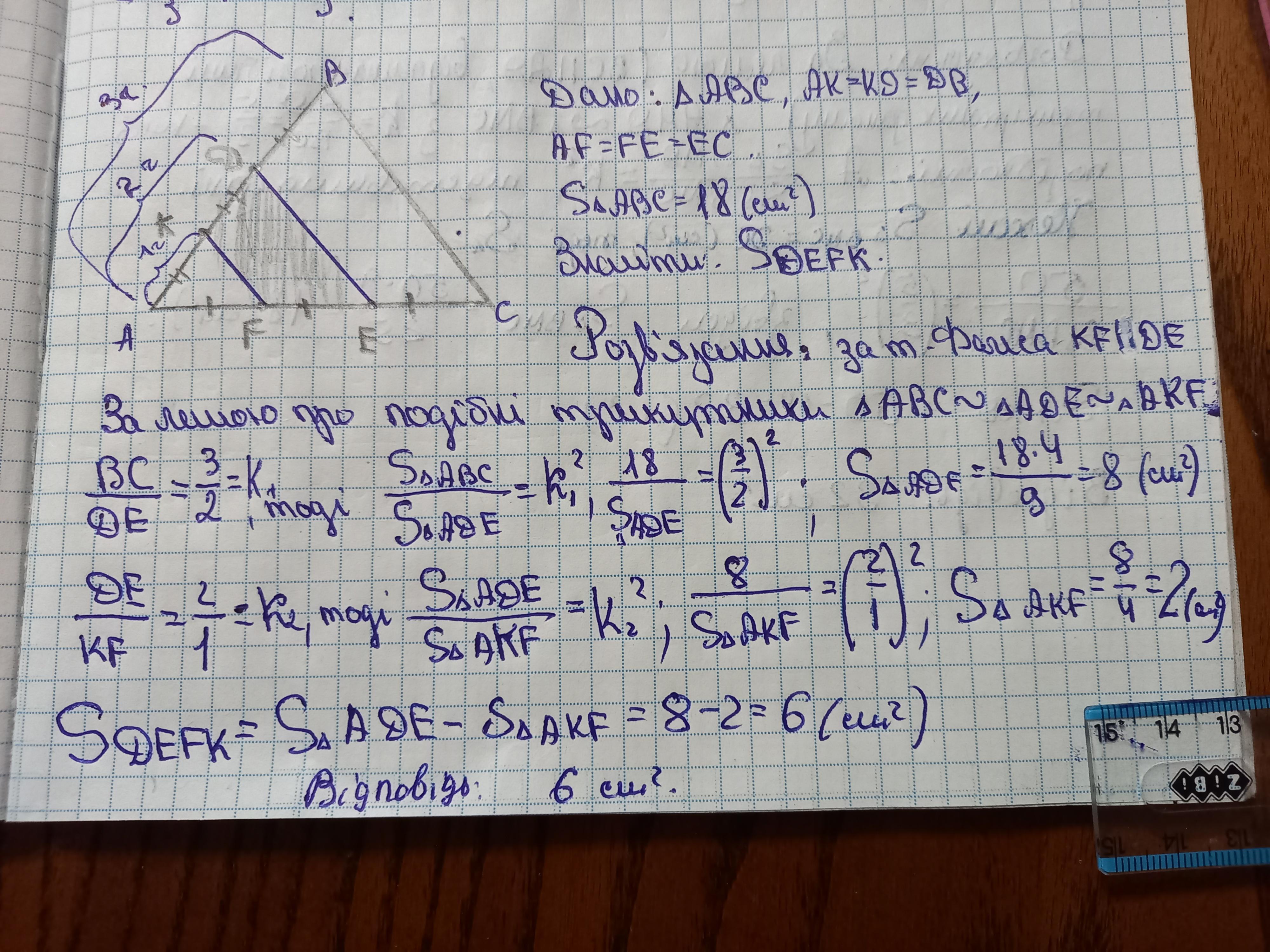 AF=FE=EC. Знайдіть площу чотирикутника DEFК.