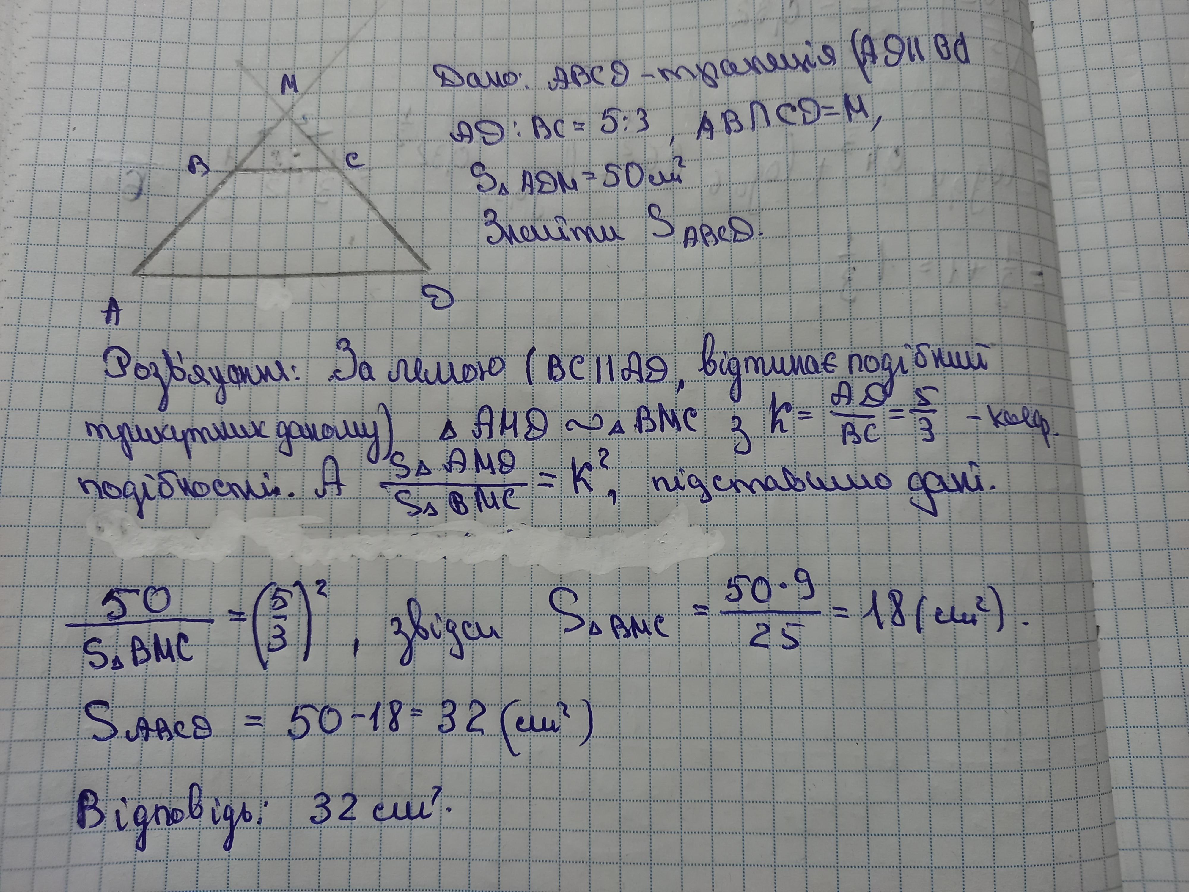 відносяться як 5:3 і площа трикутника АDМ дорівнює 50 см2, де М –