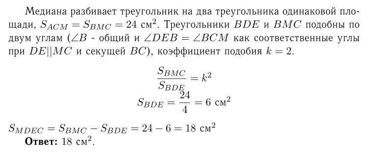 відрізок CM-медіана трикутника ABC, зображенного на рисунку, відрізок DE - середня лінія трикутника MBC.Чому дорівнює площа чотирикутника MDEC якщо площа трикутника АВС 48см квадратних.