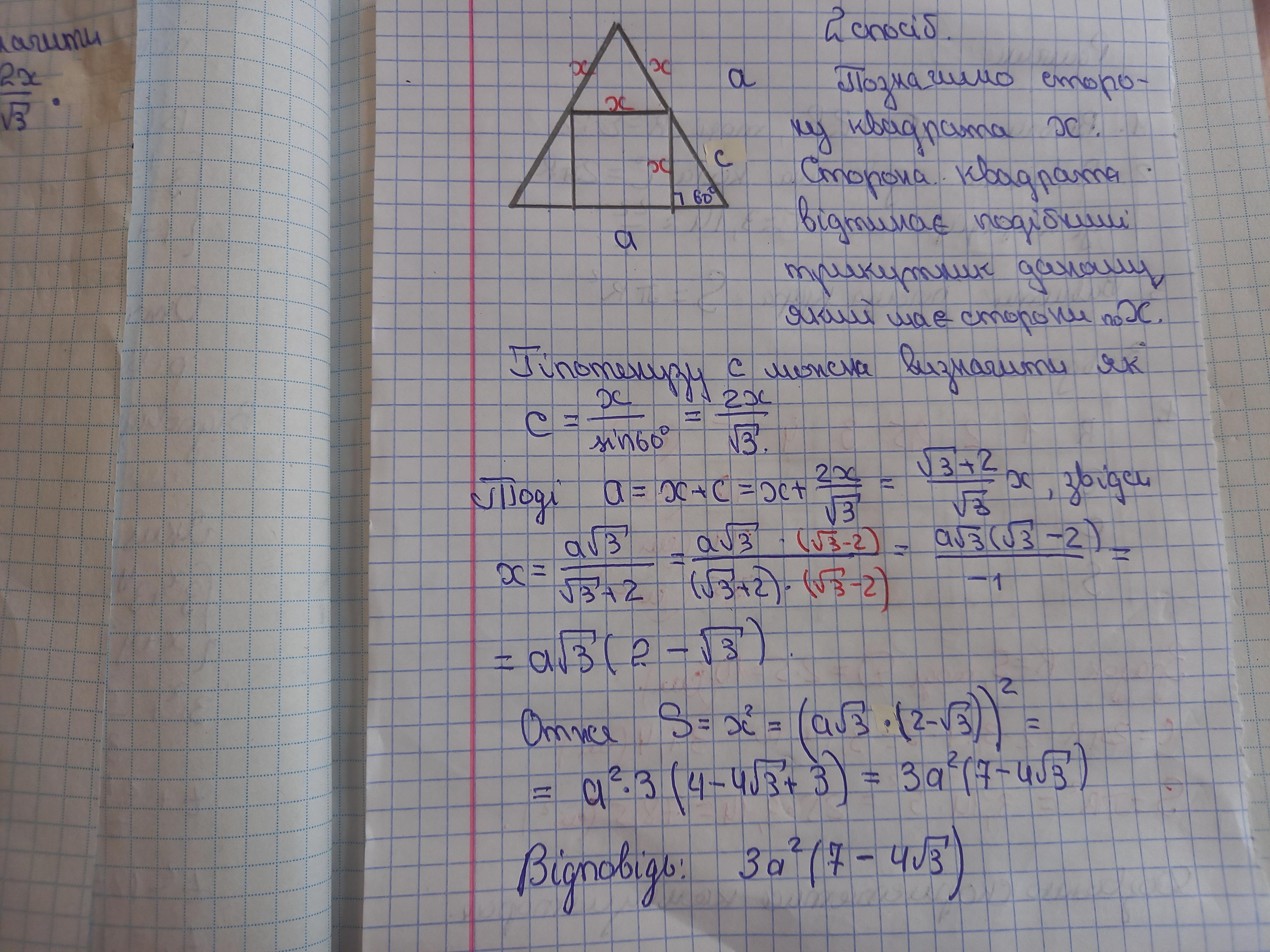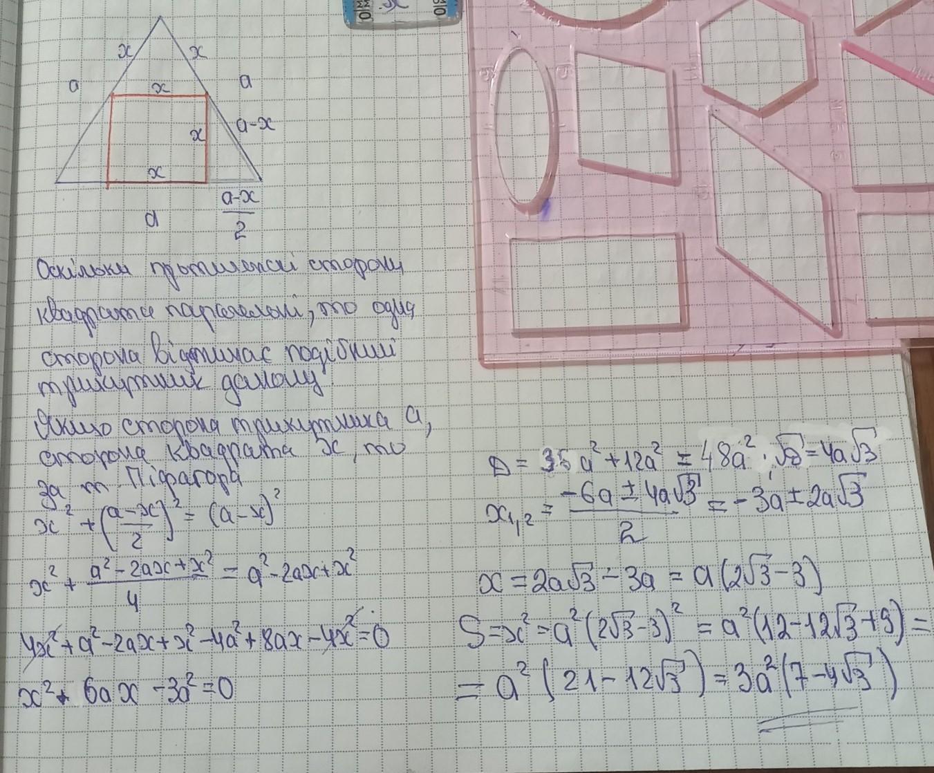 Знайти площу квадрата, вписаного в правильний трикутник зі стороною