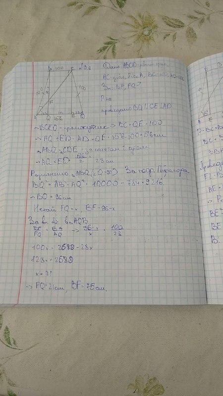 Трикутник АВС - рівнобедраний по двом кутам і січною АС, АВ=СД= 100 см. Проведемо дві висоти з тупих кутів ВК І СМ. АК=СМ = 28 КМ = 100. Знайдемо висоти по т.Пифагора ВК=СМ= (100-28)(100+28) = = 96 cм. Нехай ВО = х ОК= 96-х.Складемо пропорцію 96-х/x=100/28 =21cм. ВО=21см ОК=96-21 = 75см.