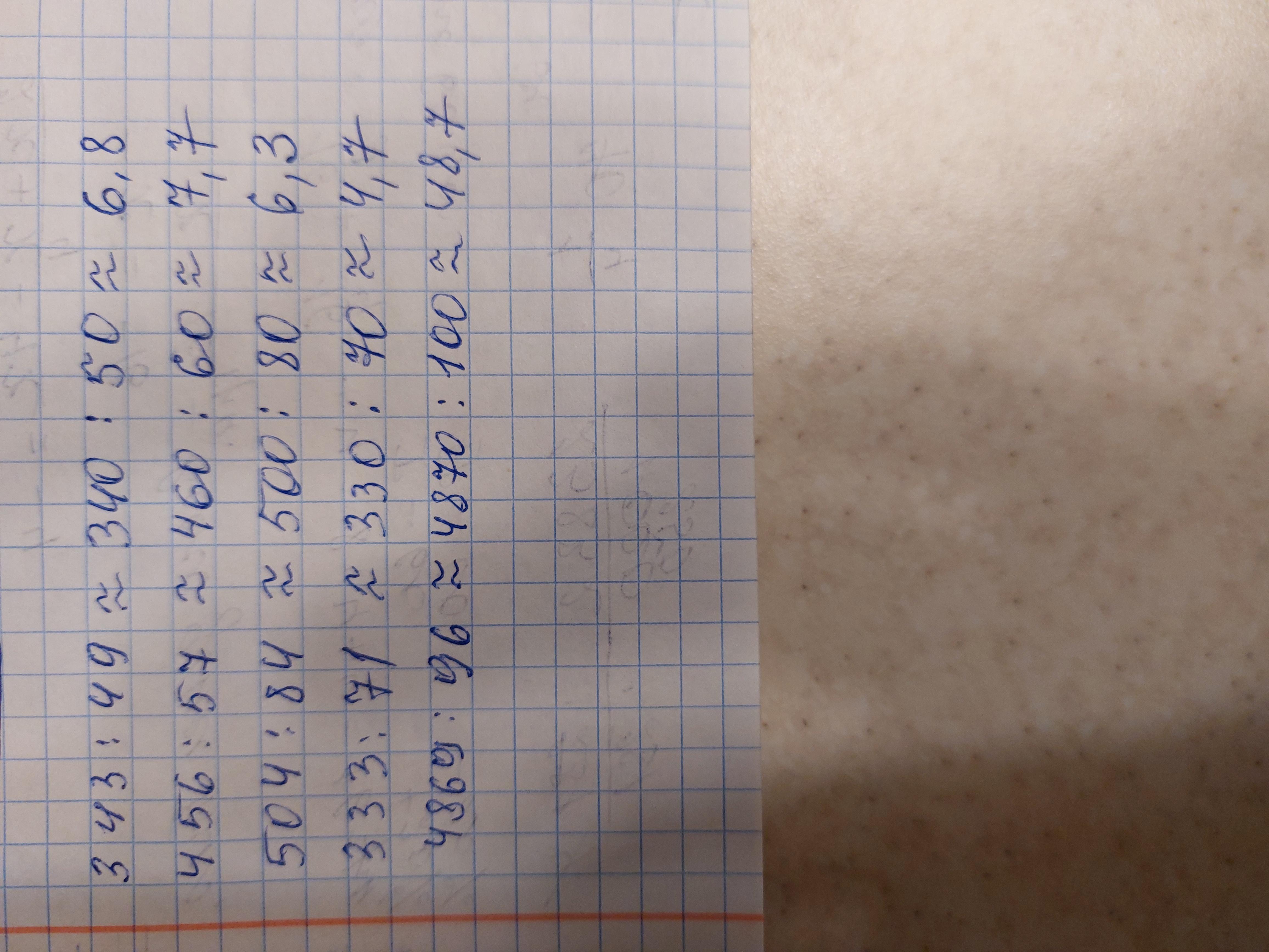 Выполни деление. При нахождении частного округляй делимое и делитель до десятков 343:49= 456:57= 504:84= 333:71= 4869:96= Помогите пожалуйста!