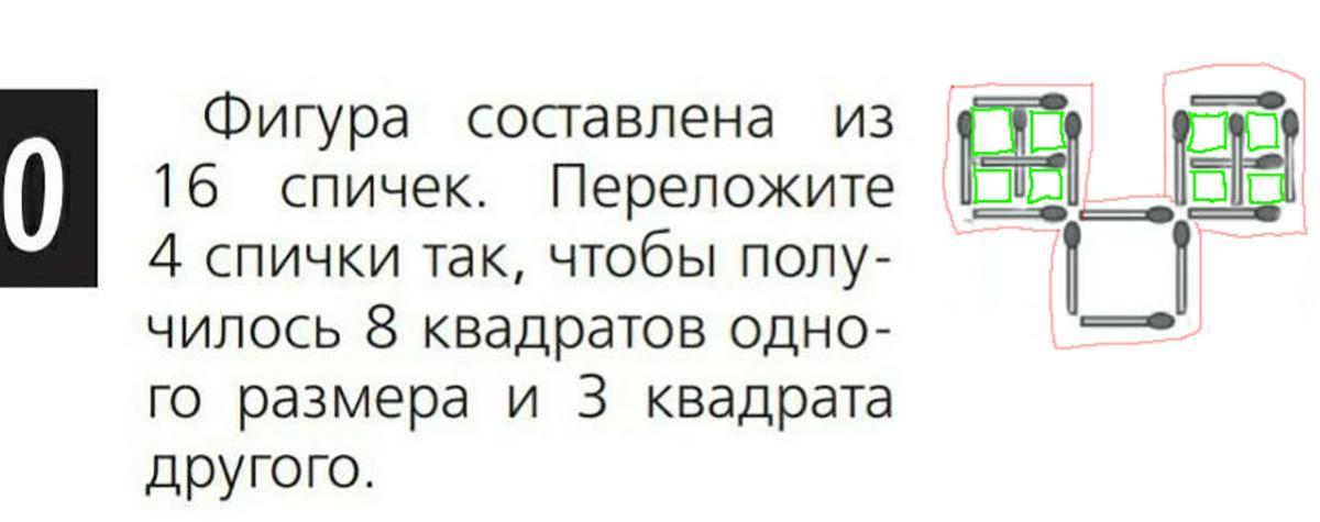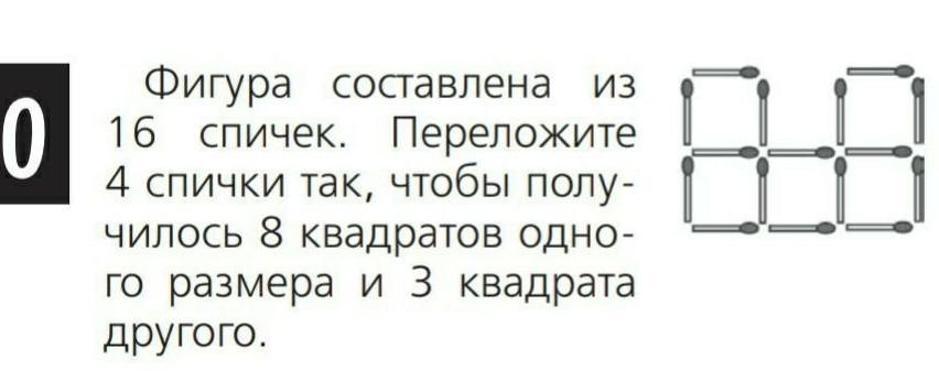 Фигура составлена из 16 спичек. Переложите 4 спички так, чтобы полу- чилось 8 квадратов одно- го размера и 3 квадрата другого.Даю 40 баллов