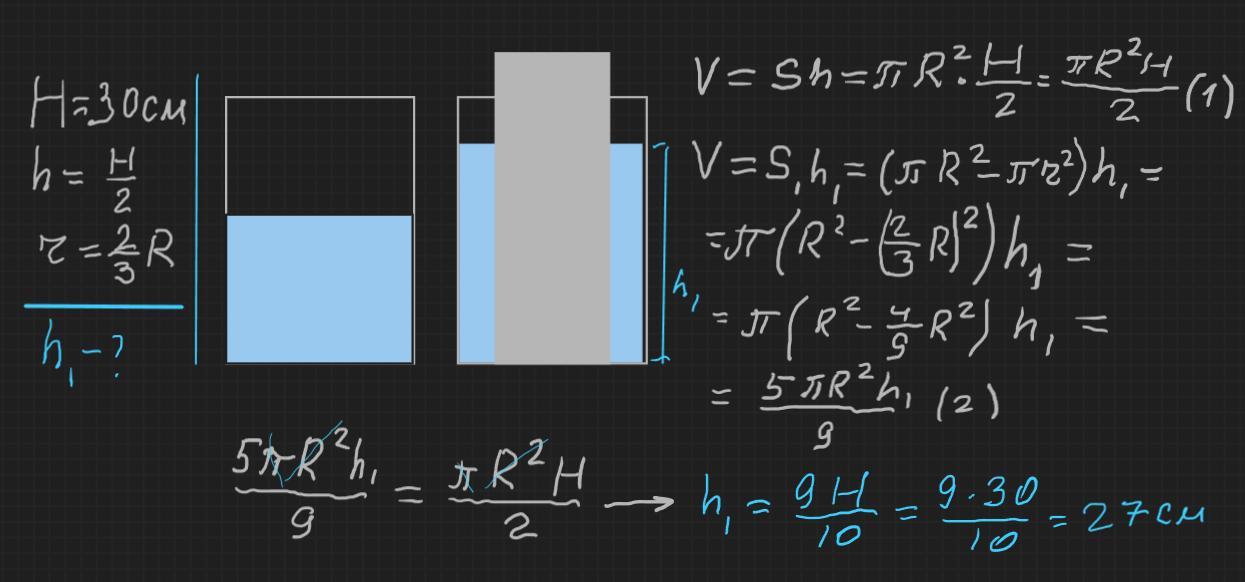 У циліндричну посудину налили води до половини. Потім вставили в неї високий циліндричний стержень радіусу, який складає 2/3 від радіусу посудини. На якій висоті від дна встановився рiвень води, якщо висота посудини 30 см?