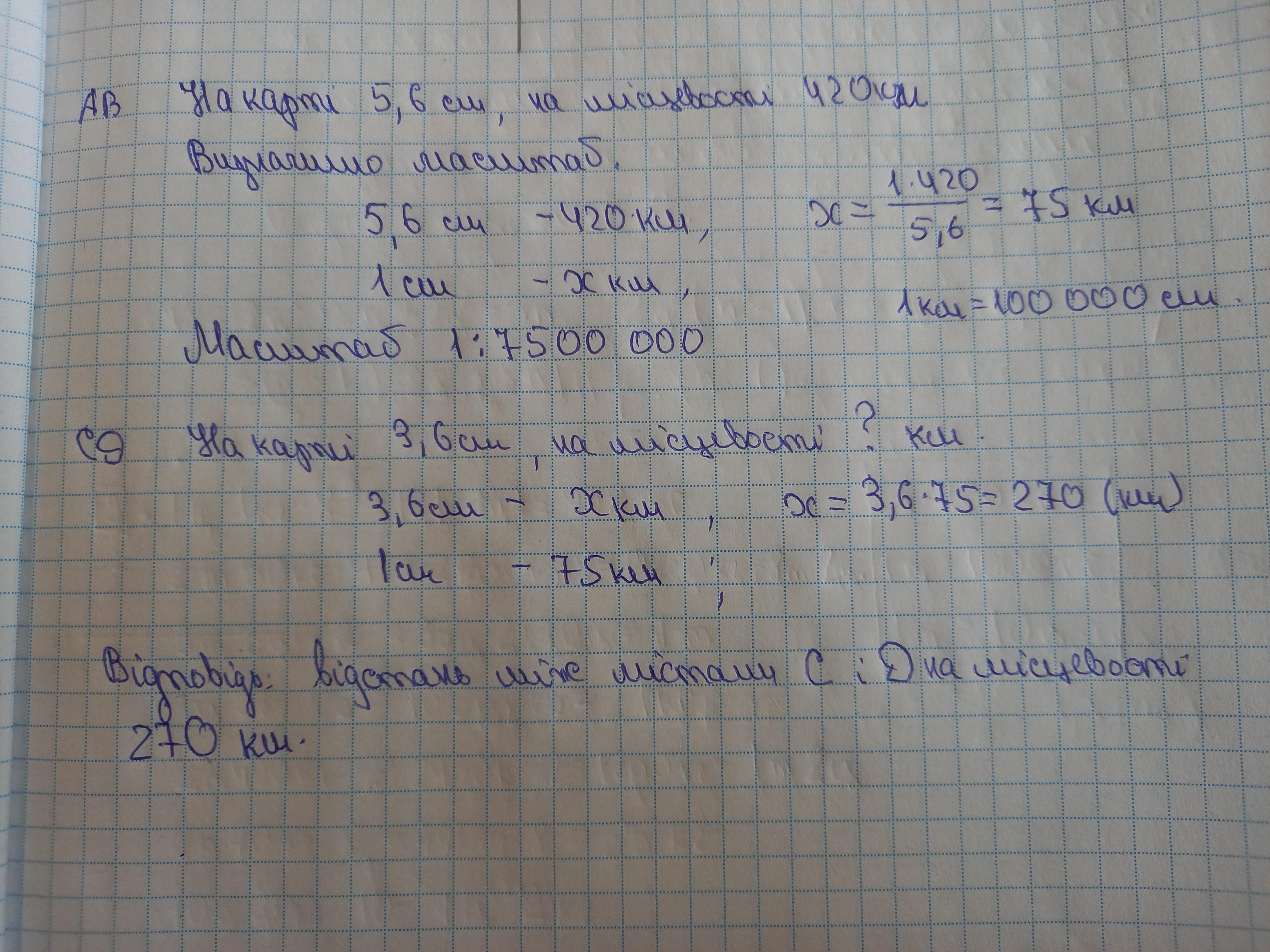 121. Відстань між містами А і В на карті дорівнює 5,6 см, а на місцевості 420 км. Яка відстань між містами C i D на місцевості, якщо на цій карті відстань між ними 3,6 см? залі 240 місць.
