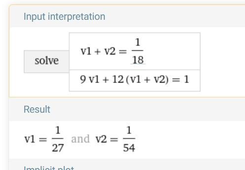 Если принять всю работу за S, как в задачах на движение, то в первом уравнении в правой части будет S/18, а во втором в правой части будет S, тогда в ответе получим v(1)=S/27, v(2)=S/54. Но у нас работа безразмерна, поэтому дополнительная переменная не нужна.