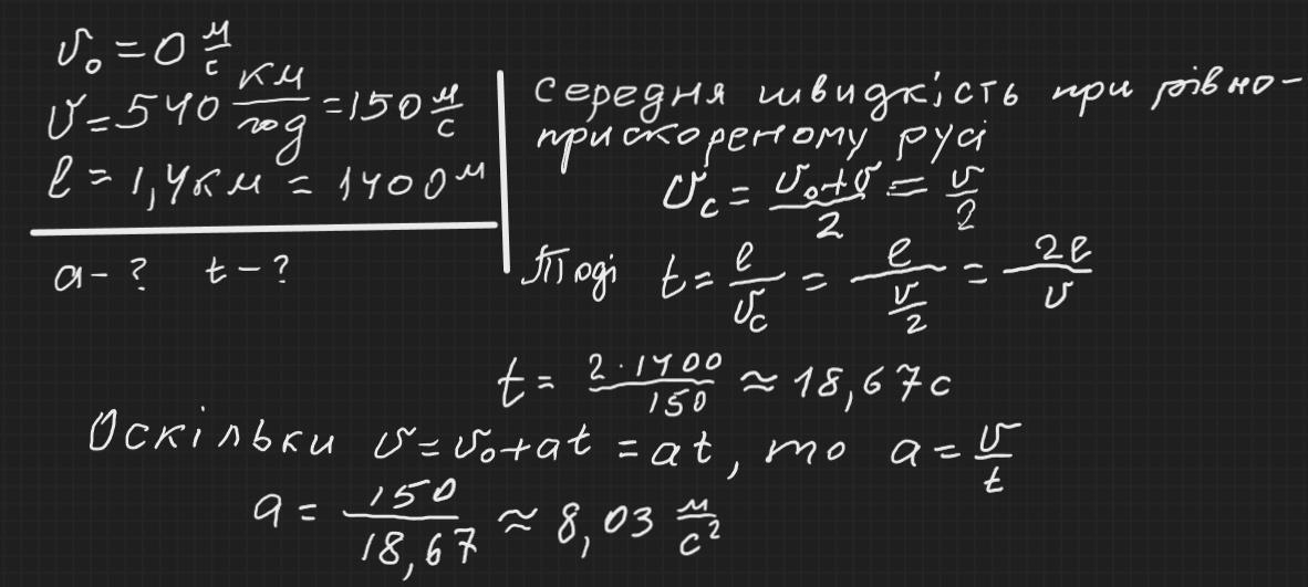 Реактивний літак злітає з аеропорту зі швидкістю 540 км/год , пробігши по злітній смузі 1,4 км . З яким прискоренням рухався літак і скільки часу тривав пробіг?
