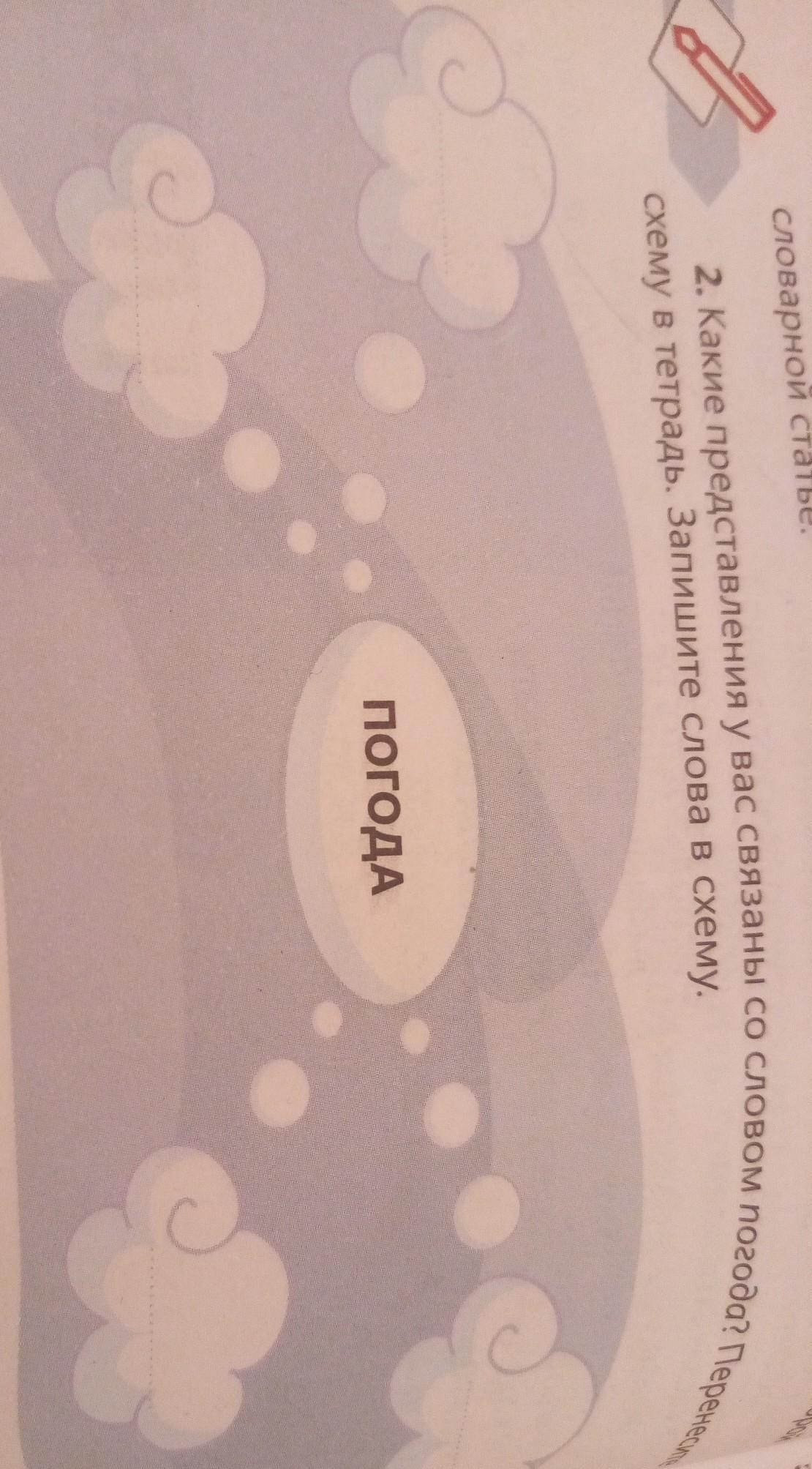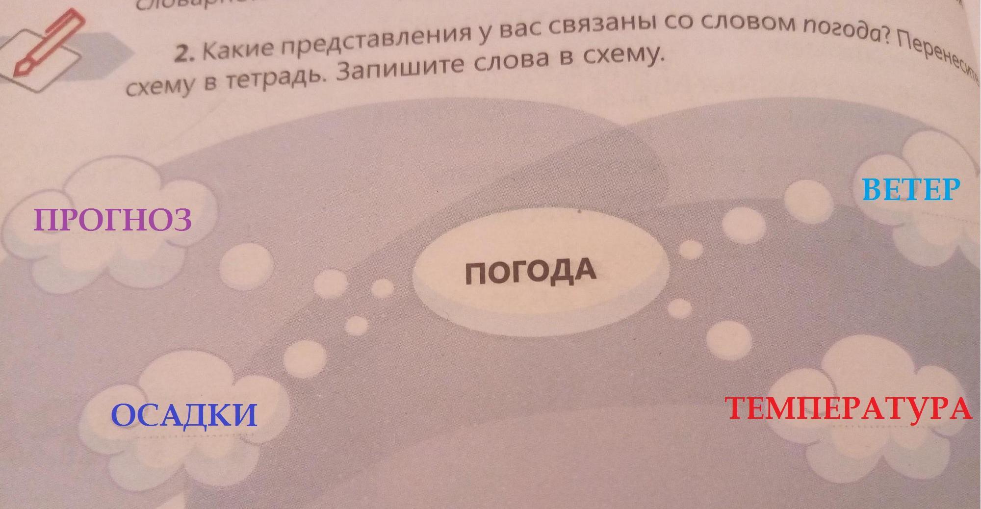 2. Какие представления связанные со словом погода перенесите схему в тетрадь Запишите слова схемы погода.
