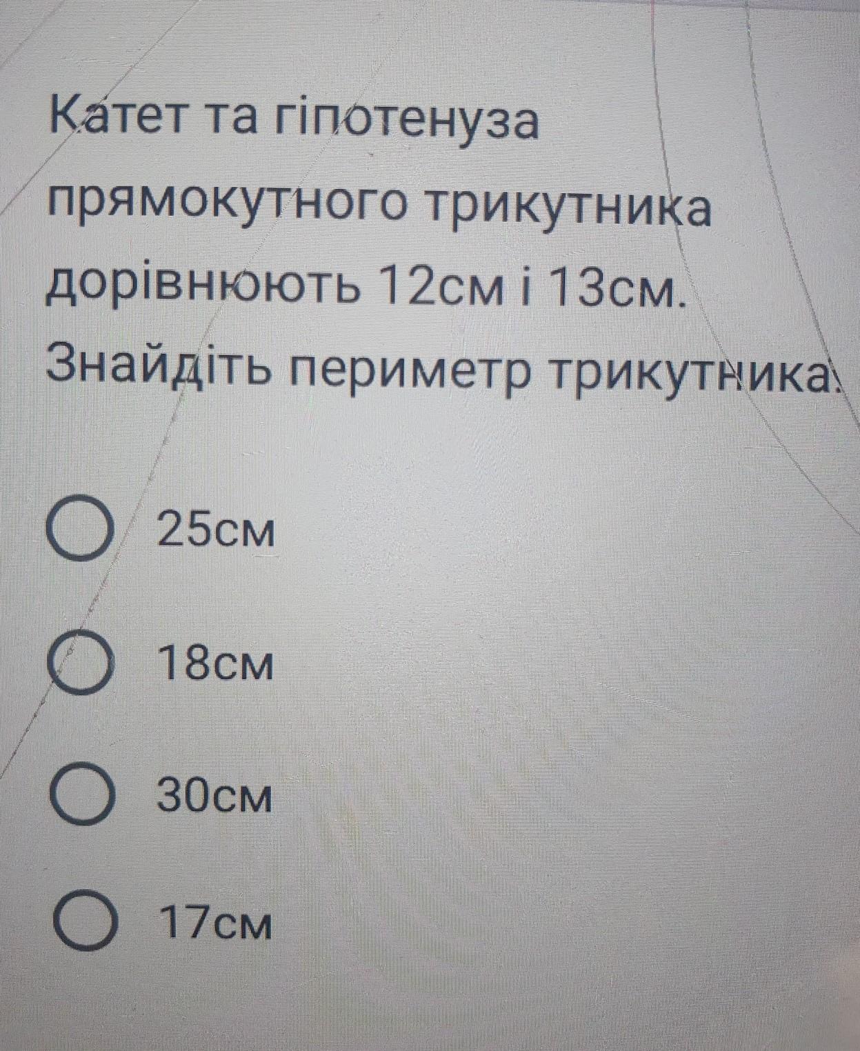 Катет та гіпотенуза прямокутного трикутника дорівнюють 12см i 13см. Знайдіть периметр трикутника. 25CM 18CM О 30см О 17CM