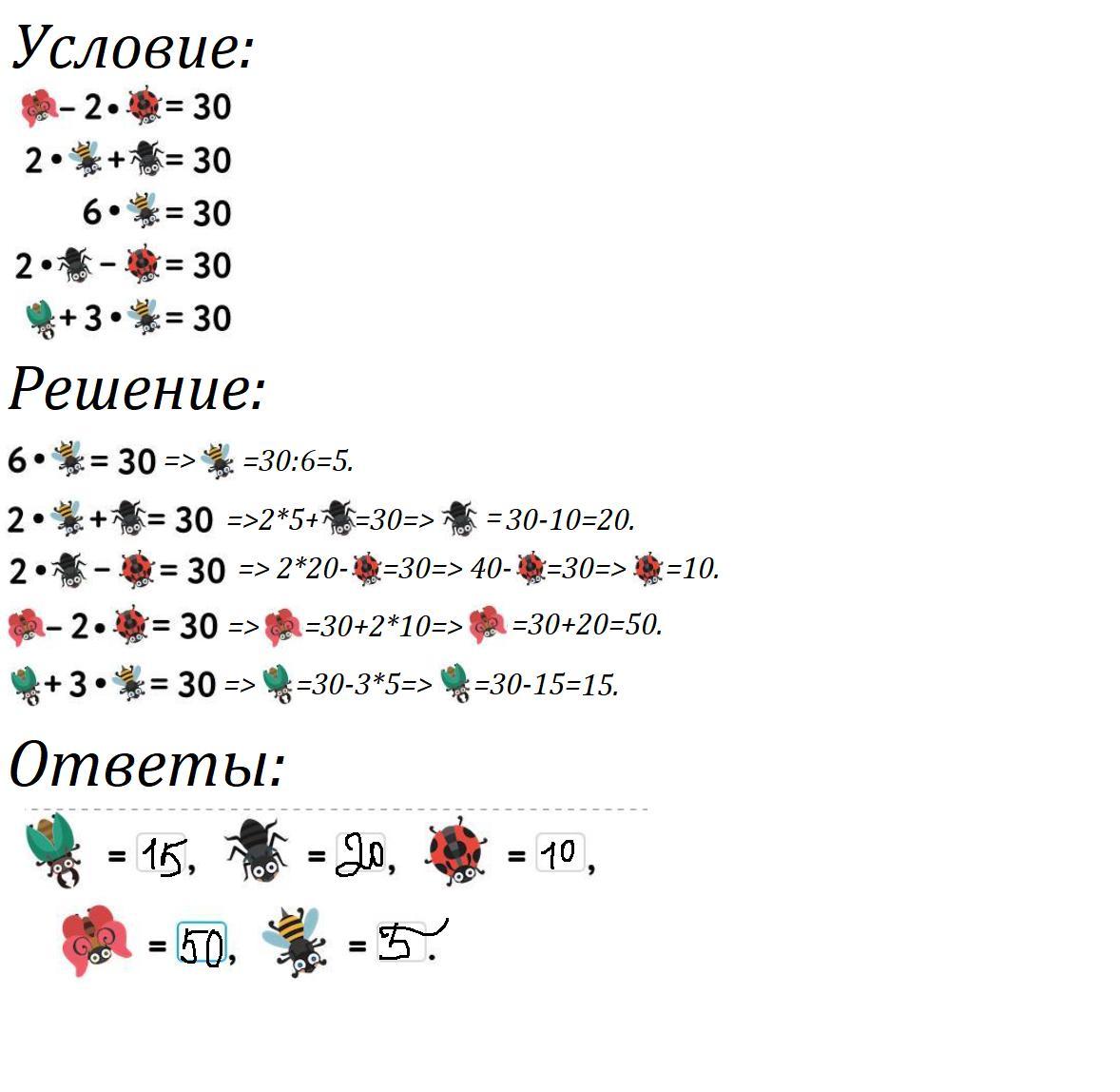 В последнее выражение подставляем пчёлку. Жук +3*5=30