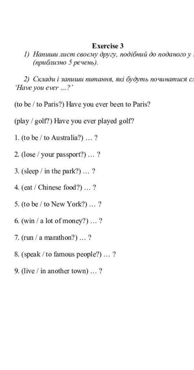 2) Склади і запиши питання, які будуть починатися словами 'Have you ever...?"
