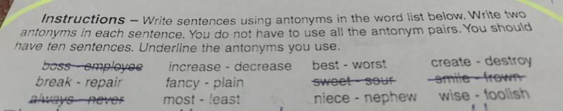 have ten sentences. Underline the antonyms you use.