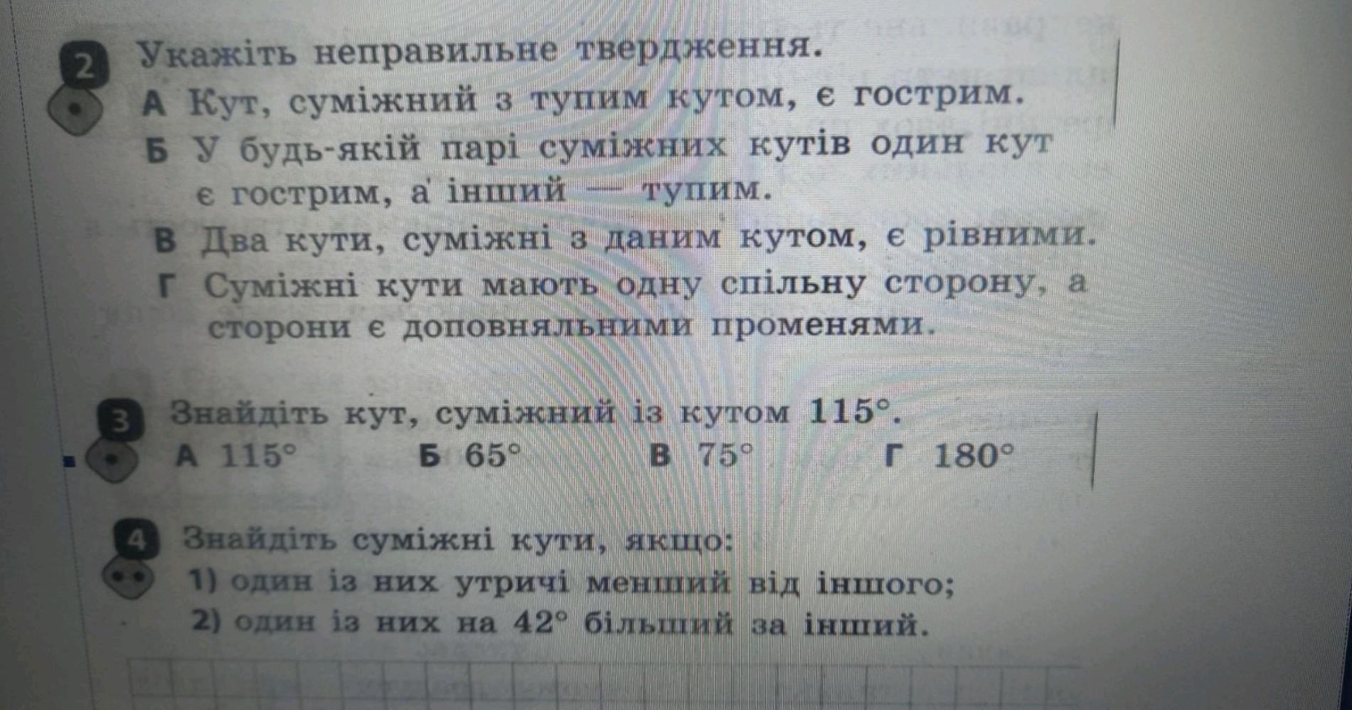 2. неправильна відповідь б) , бо суміжні кути ще можуть бути прямими (тобто кожен з них дорівнюватиме 90°)
