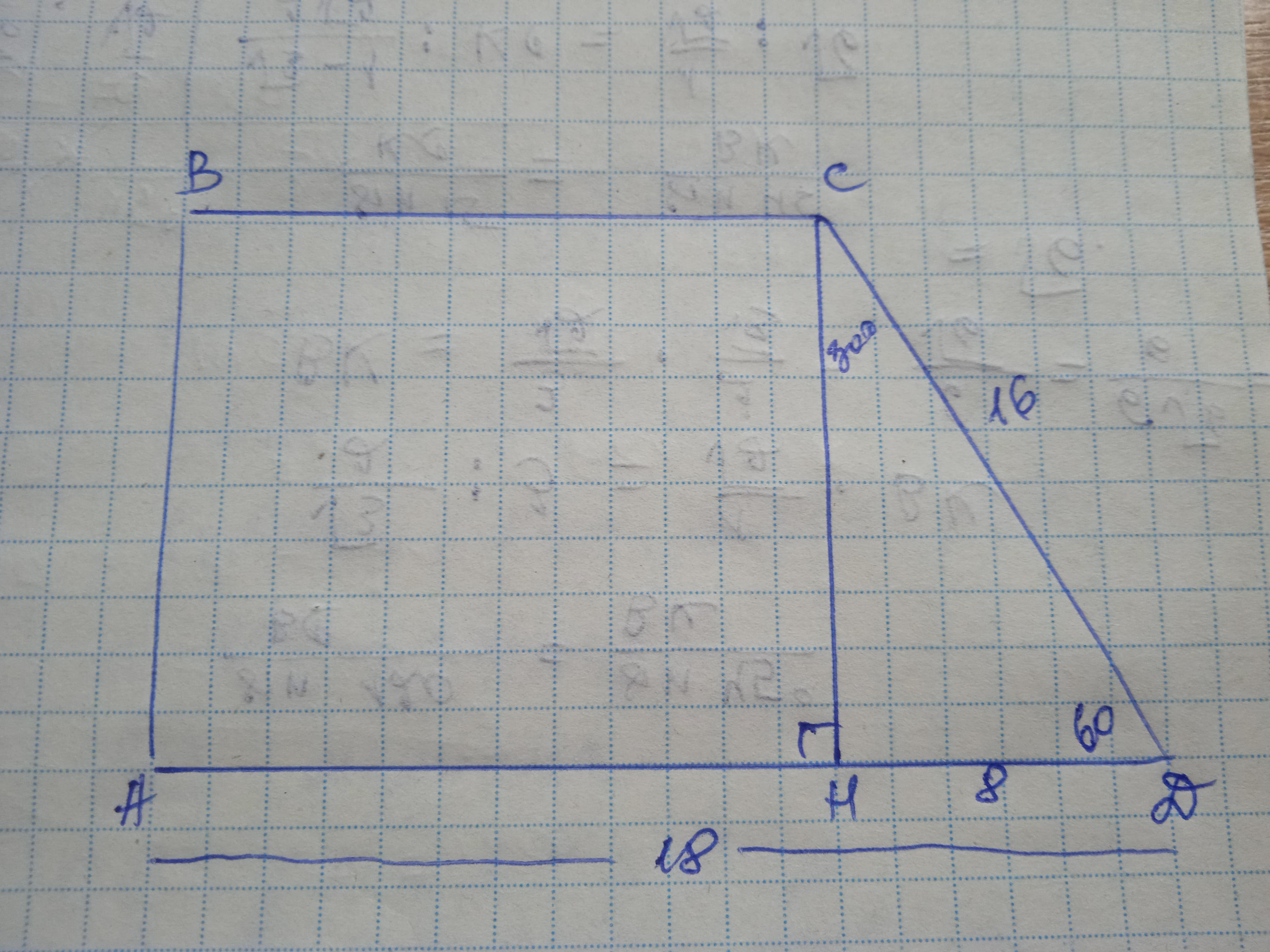 Дано: АВСD - трапеция, АВ⊥АD, АD=18 см, СD=16 см, ∠Д=60°. S(ABCD) - ?