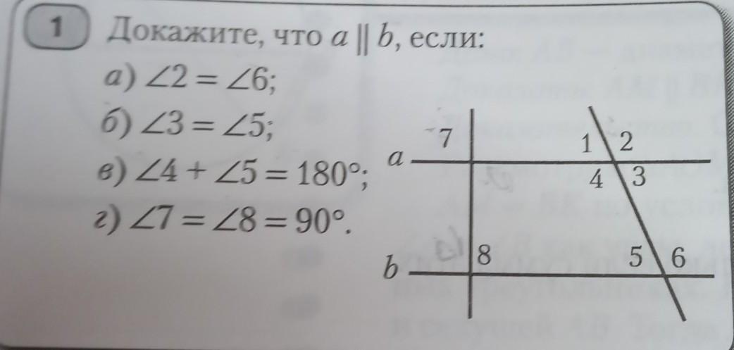 г) угол 7= углу 8=90 ° ( по условию) , значит прямые а и b перпендикулярны к секущей. Две прямые , перпендикулярные к третьей , не пересекаются, то есть они параллельны а || b