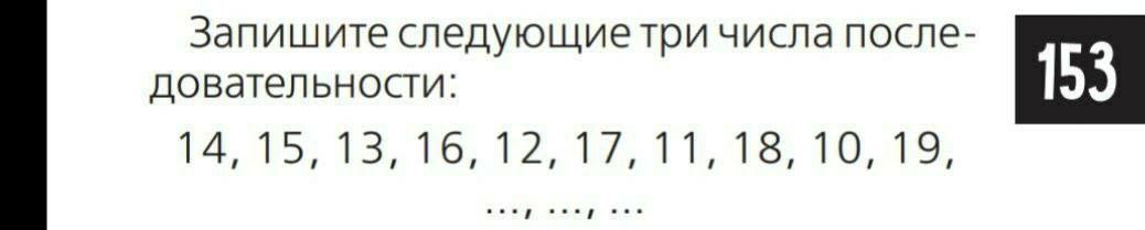 Запишите следующие три числа после- довательности: 14, 15, 13, 16, 12, 17, 11, 18, 10, 19, .../ ... ...