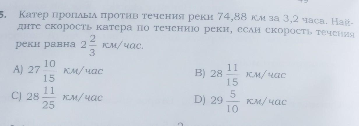 74,88: 3,2 =748,8 : 32 = 23, 4 ( км/ч) - скорость катера против течения реки.