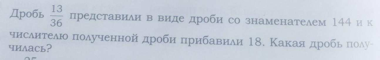 нам надо привести знаменатель к 144 а это 36×4, так как это дробь числитель тоже надо умножить на 4, 13×4=52, в условии надо прибавить к числителю 18 получается 52+18=70)