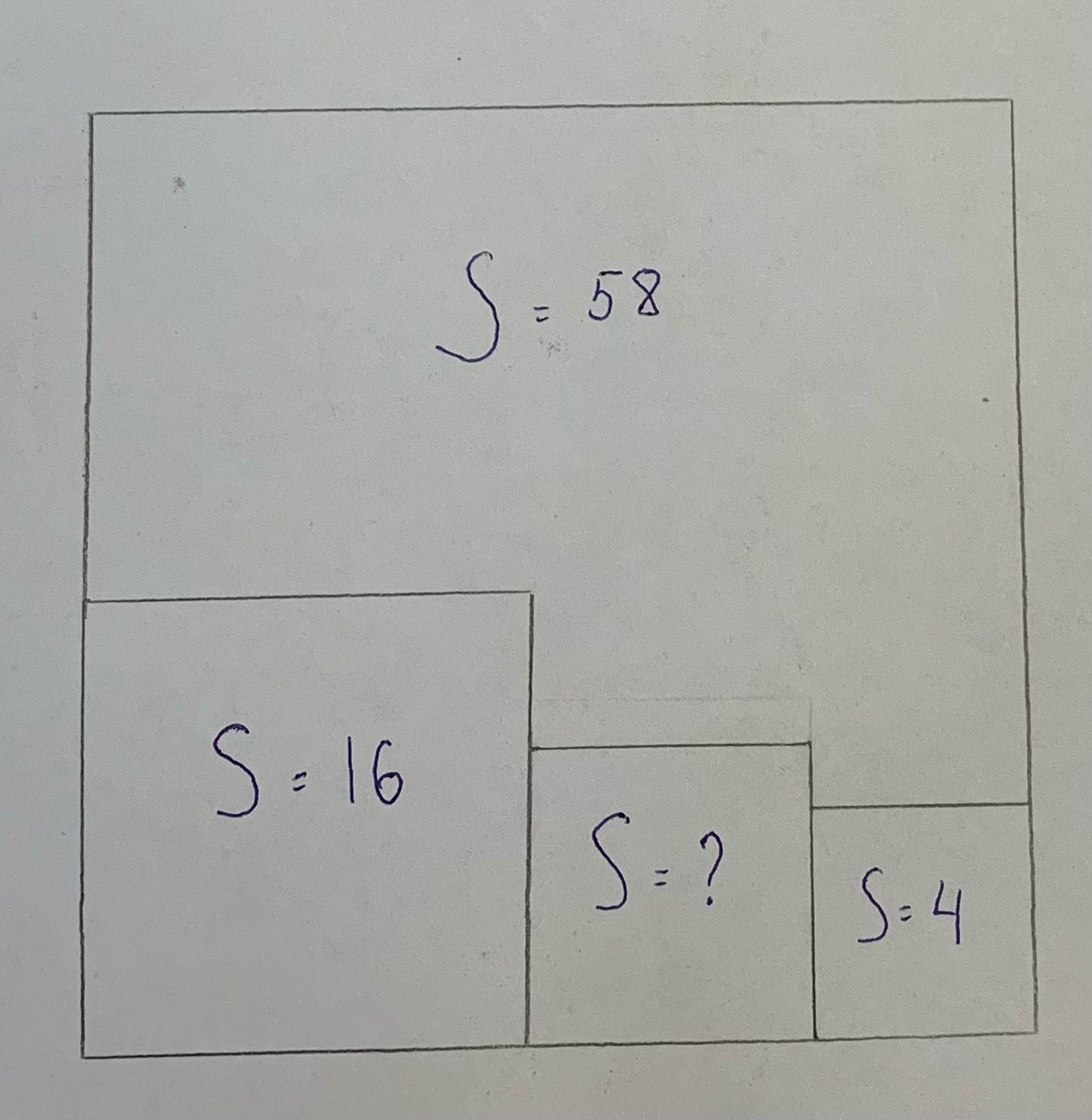 В квадрат вписаны три квадрата, по нижней стороне, от большего к меньшему. Известны площади: S = 58 (фигура без вписанных квадратов), S=16 (большой вписанный), S=4 (маленький вписанный). Найти площадь среднего вписанного квадрата.