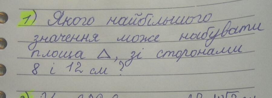 Площу трикутника можна обчислювати за формулою S = 1/2*ab×sinα, де α - кут між сторонами a i b, тоді площа буде найбільшою за умови, що sinα = 1, тобто α = 90°. Отже найбільша площа S = 1/2*ab = 1/2*8*12 = 48 см²