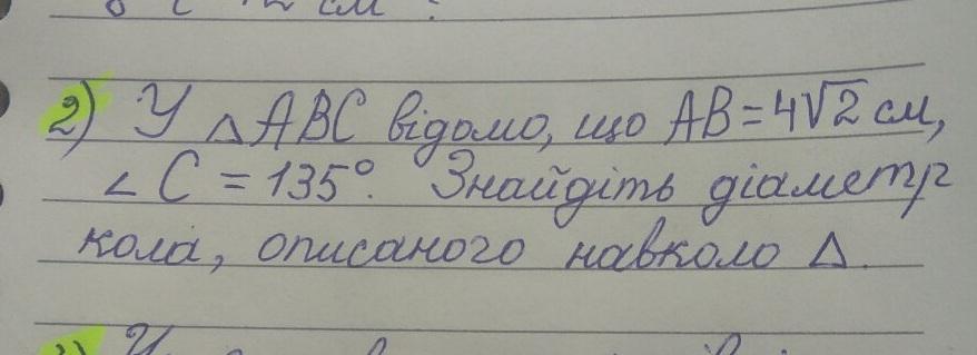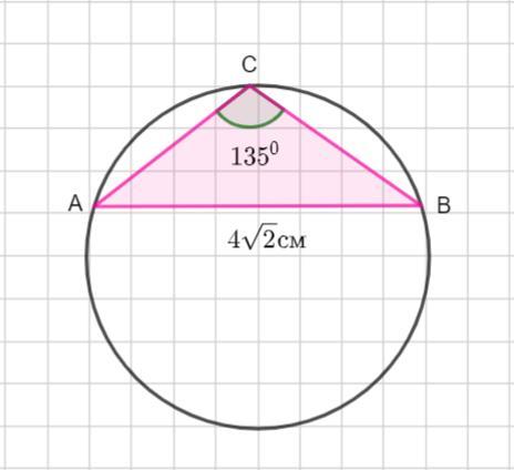 В Δ АВС известно, что АВ =4√2 см, ∠С =135°. Найти диаметр окружности, описанной около ΔАВС.
