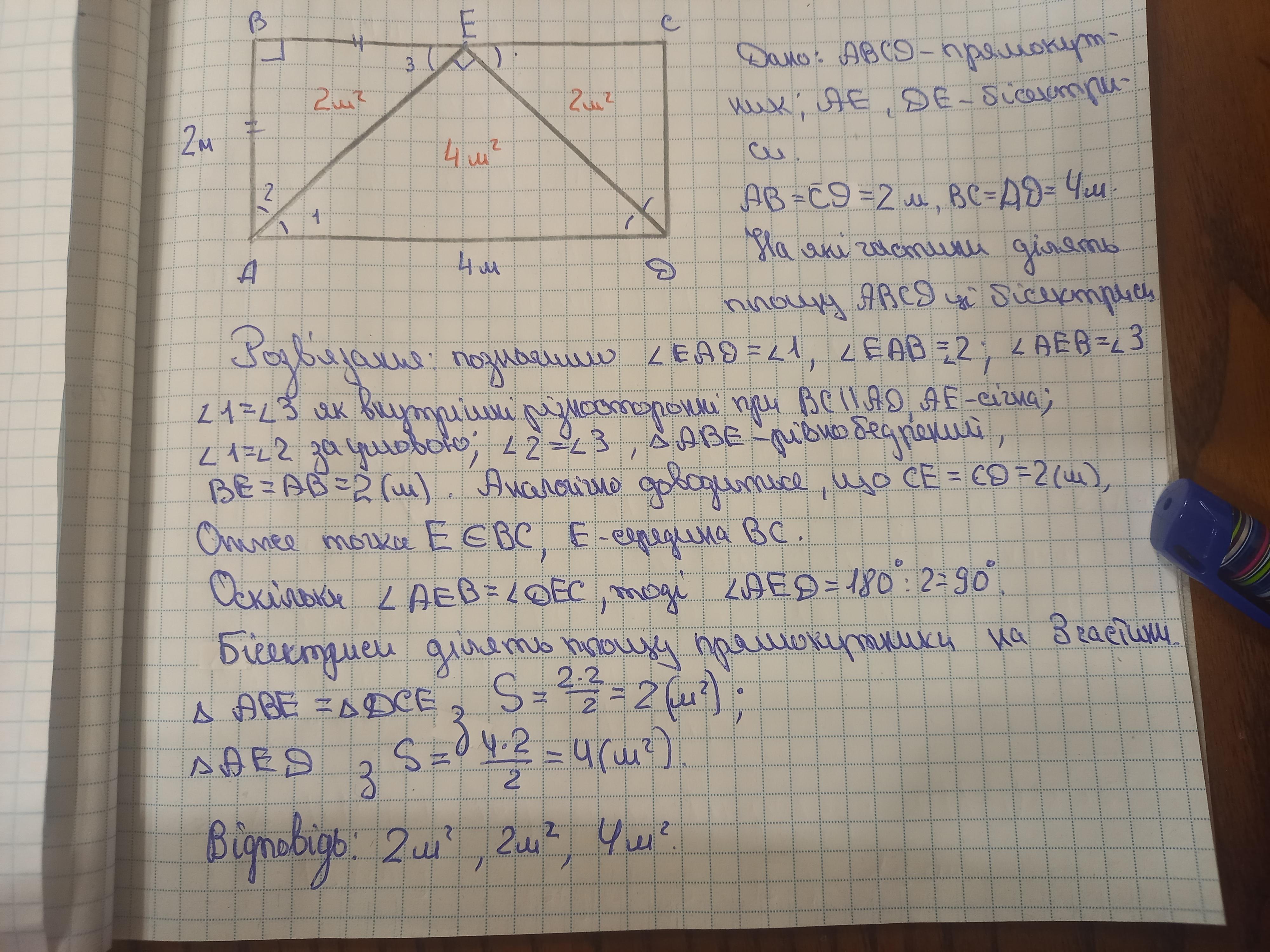 сторони. На які частини ділять площу прямокутника ці бісектриси, якщо