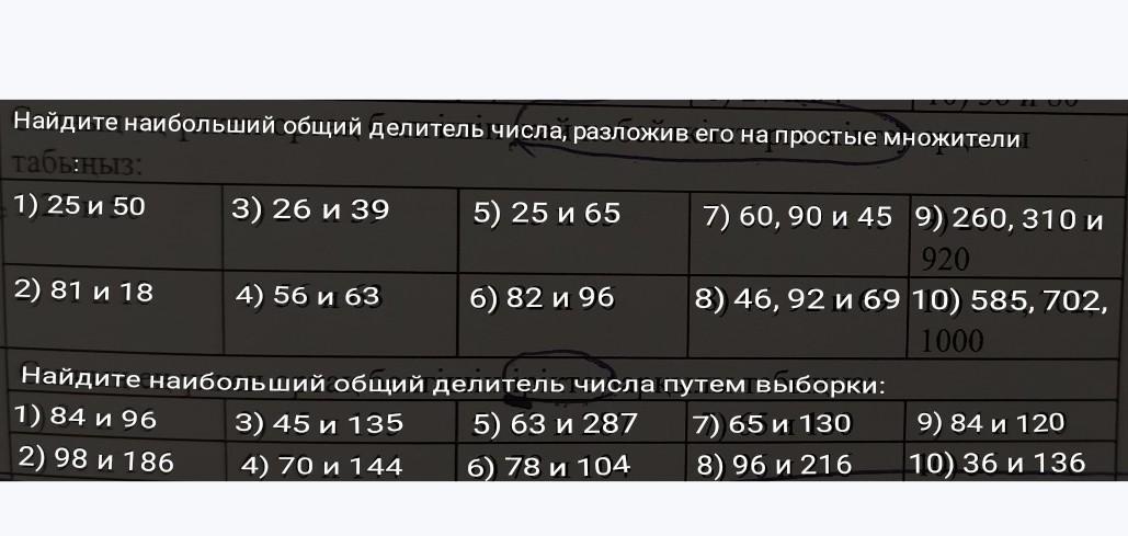Найдите наибольший общий делитель числа, разложив его на простые множители 1) 25 и 50 2) 81 n 18 3) 26 и 39 4) 56 и 63 Найдите наибольший общий 1) 84 и 96 3) 45 n 135 2) 98 и 186 4) 70 n 144 5) 25 и 65 6) 82 и 96 делитель числа 5) 63 и 287 6) 78 и 104 7) 60, 90 и 45 9) 260, 310 и 920 8) 46, 92 и 69 10) 585, 702, 1000 путем выборки: 7) 65 n 130 8) 96 и 216 9) 84 и 120 10) 36 и 136