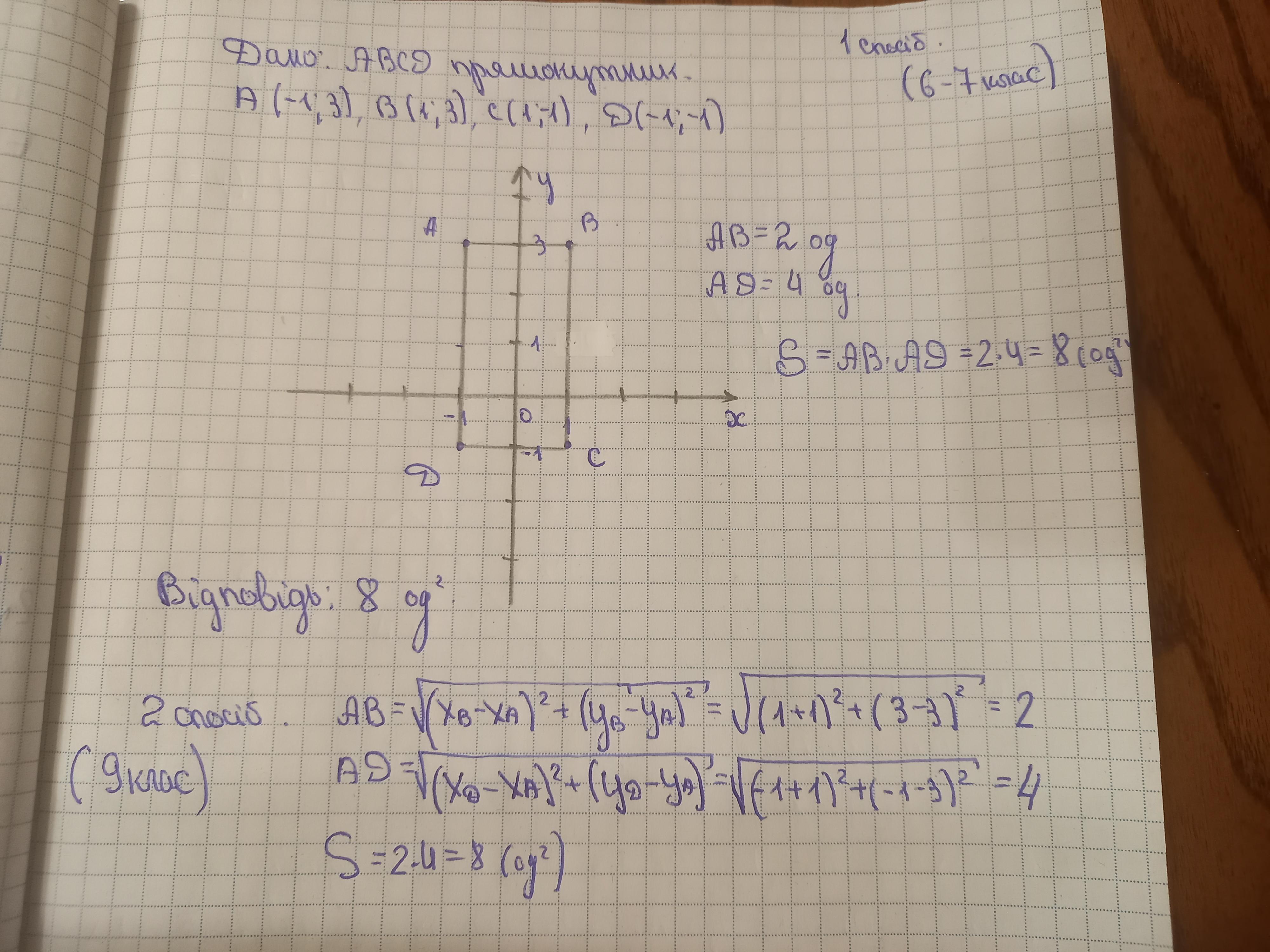 Задание. Найдите площадь прямоугольника ABCD, если А (- 1;3), В (1;3), С (1;-1), D (-1;-1). Расписать подробно с координатной плоскостью. Желательно координатную плоскость изобразить с помощью программ компьютера или ноутбука, но если нет возможности, то нарисуйте от руки, пожалуйста.