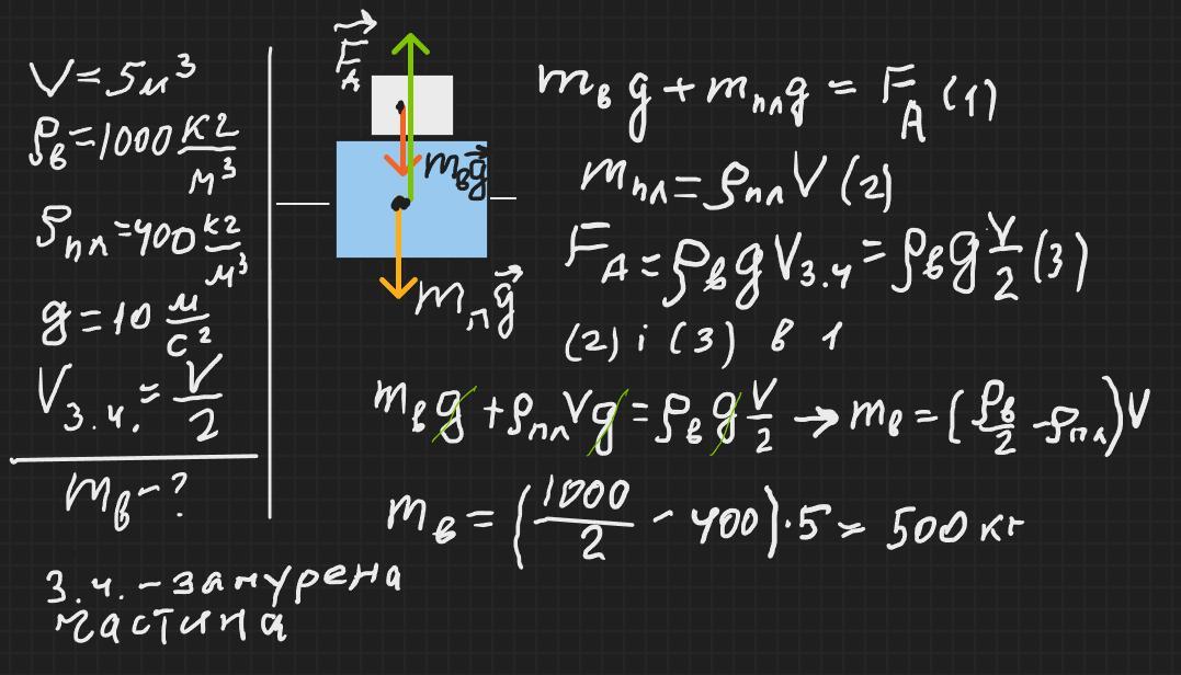 Навантажений пліт об'ємом 5 м3 наполовину занурений у воду. Визначте масу вантажу, якщо густина води дорівнює 1000 кг/м3, густина матеріалу, з якого виготовлений пліт,— 400 кг/м3. Вважайте, що g = 10 м/с2.