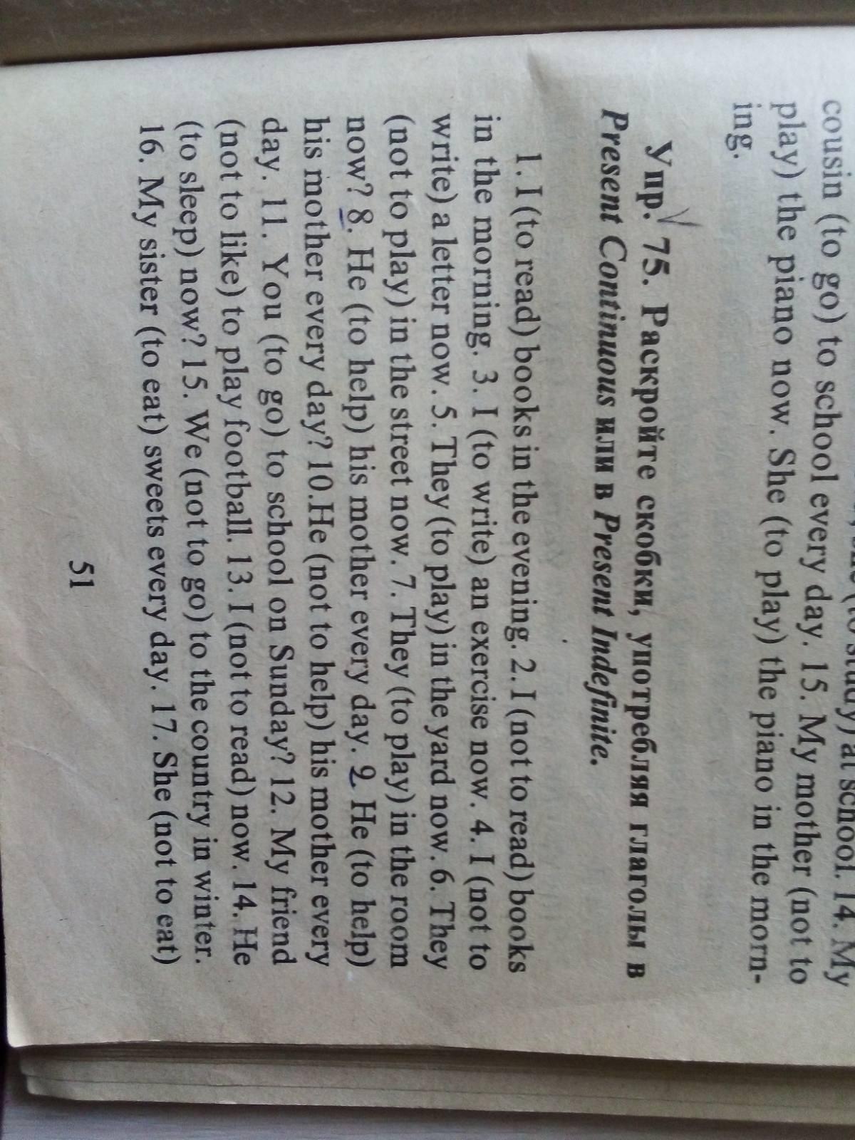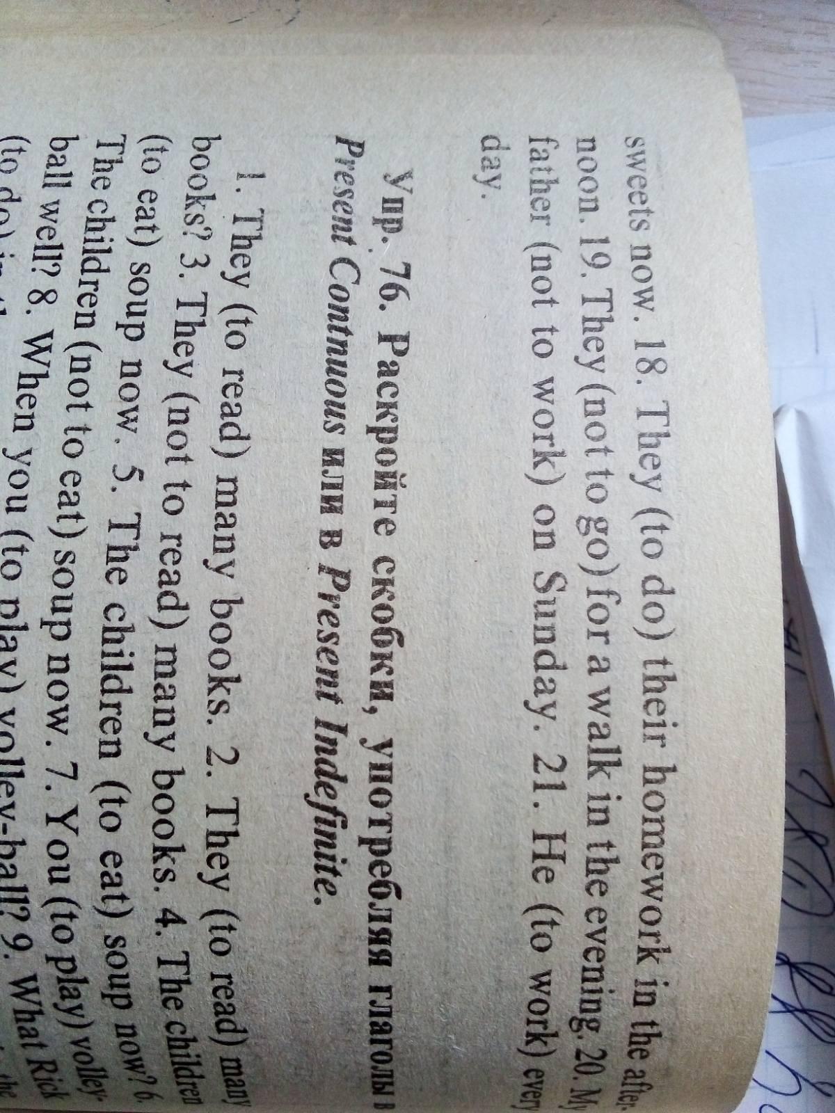 1) I read books in the evening. 2) I don't read books in the morning. 3) I am writing an exercise now. 4) I am not writing a letter now. 5) They are playing in the yard now. 6) They are not playing in the street now. 7) Are they playing in the room now ? 8) He helps his mother every day. 9) Does he help his mother every day ? 10) He doesn't help his mother every day. 11) Do you go to school on Sunday? 12) My friend doesn't like to play football. 13) I am not reading now. 14) Is he sleeping now ? 15) We don't go to the country in winter. 16) My sister eats sweets every day. 17) She is not eating sweets now. 18) They do their homework in the afternoon. 19) They don't go for a walk in the evening. 20) My father doesn't work on Sunday. 21) He works every day.