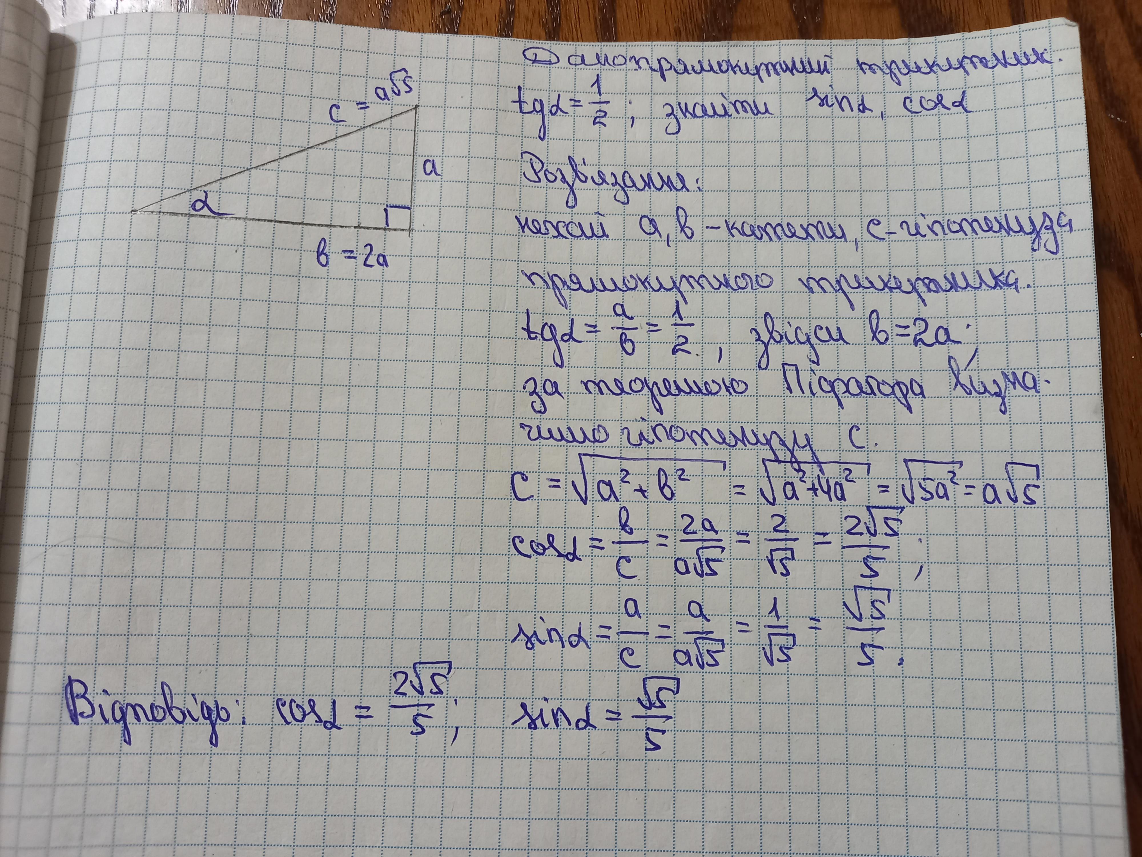 - Косинус острого угла прямоугольного треугольника равен отношению прилежащего катета к гипотенузе: