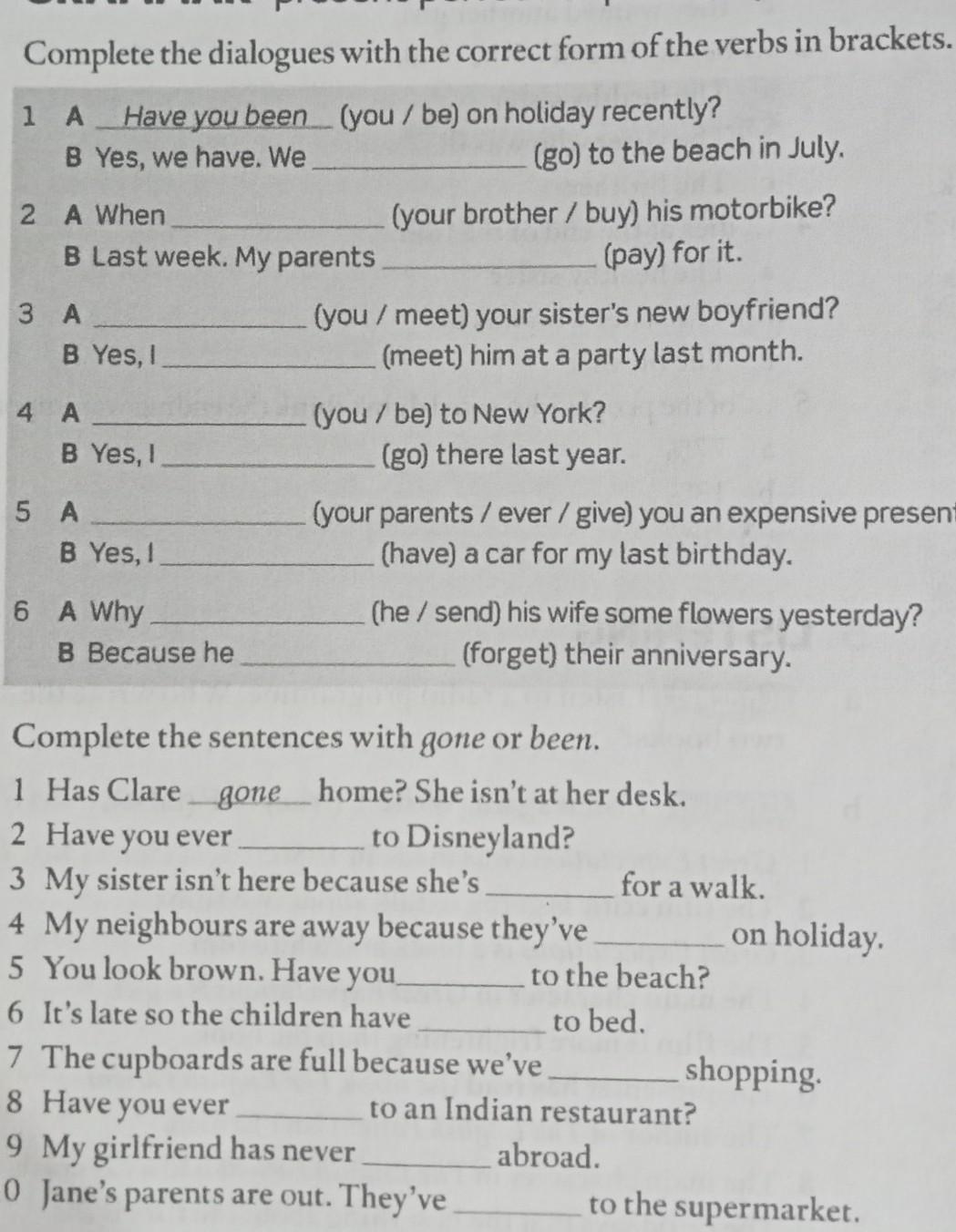 Во втором задании нужно выбрать, использовать ли глагол gone или been.