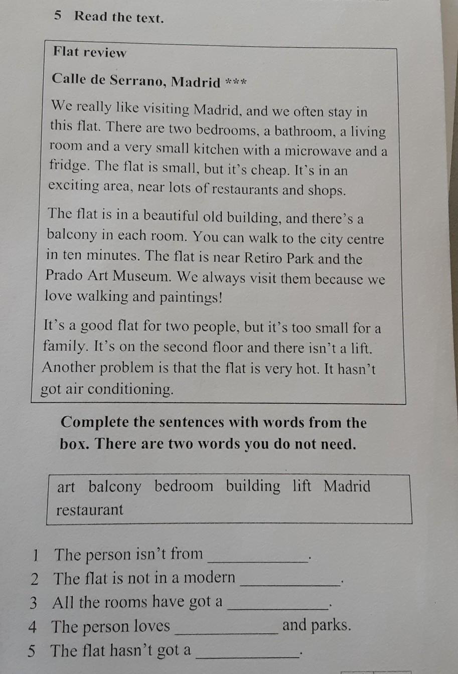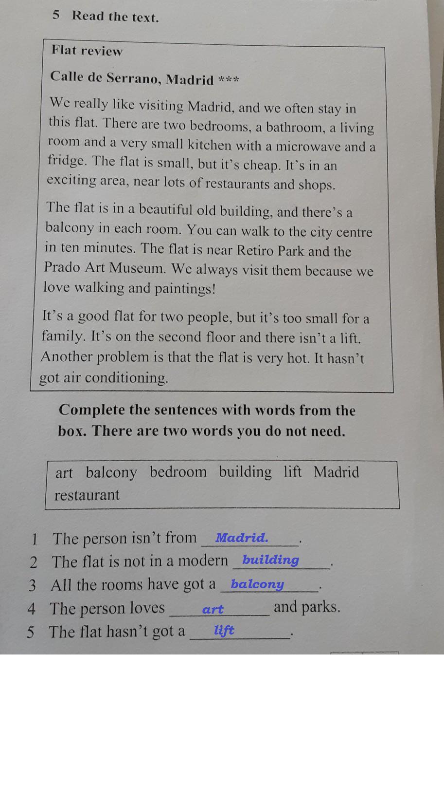 Ответ: 1. Madrid. 2. building. 3. balcony. 4. Art. 5. lift.