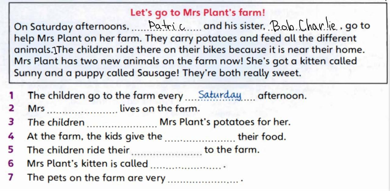 On Saturday afternoons, and his sister, Bob. Charlie, go to help Mrs Plant on her farm. They carry potatoes and feed all the different animals. The children ride there on their bikes because it is near their home. Mrs Plant has two new animals on the farm now! She's got a kitten called Sunny and a puppy called Sausage! They're both really sweet. 1 2 3 Let's go to Mrs Plant's farm! Patric 4 5 6 7 The children go to the farm every Saturday afternoon. Mrs........... lives on the farm. Mrs Plant's potatoes for her. The children At the farm, the kids give the .......... The children ride their ...... Mrs Plant's kitten is called. The pets on the farm are very their food. to the farm.
