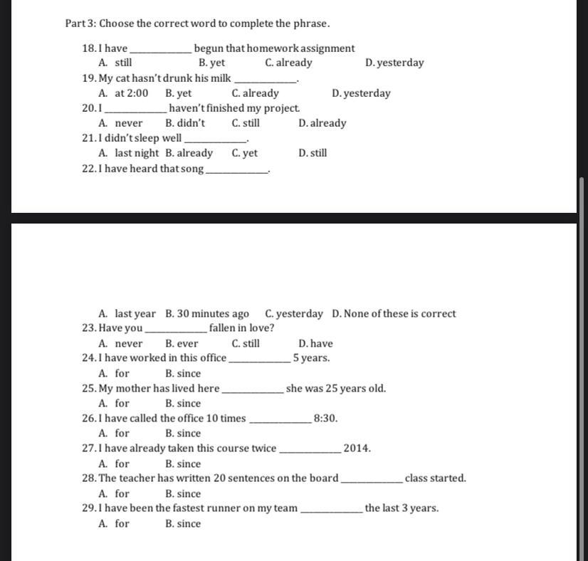 Т.к. все 3 первых ответа это сигналы Past Simple, а у нас Present Perfect.