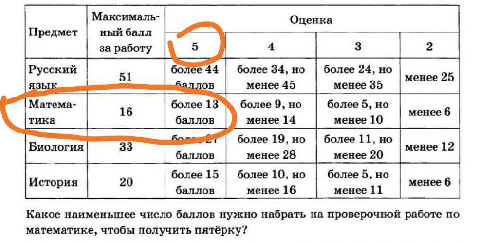 Ответ : 14 баллов ето наименьшее число котороє нужно набрать на проверочной работе по математике чтоби получить 5.