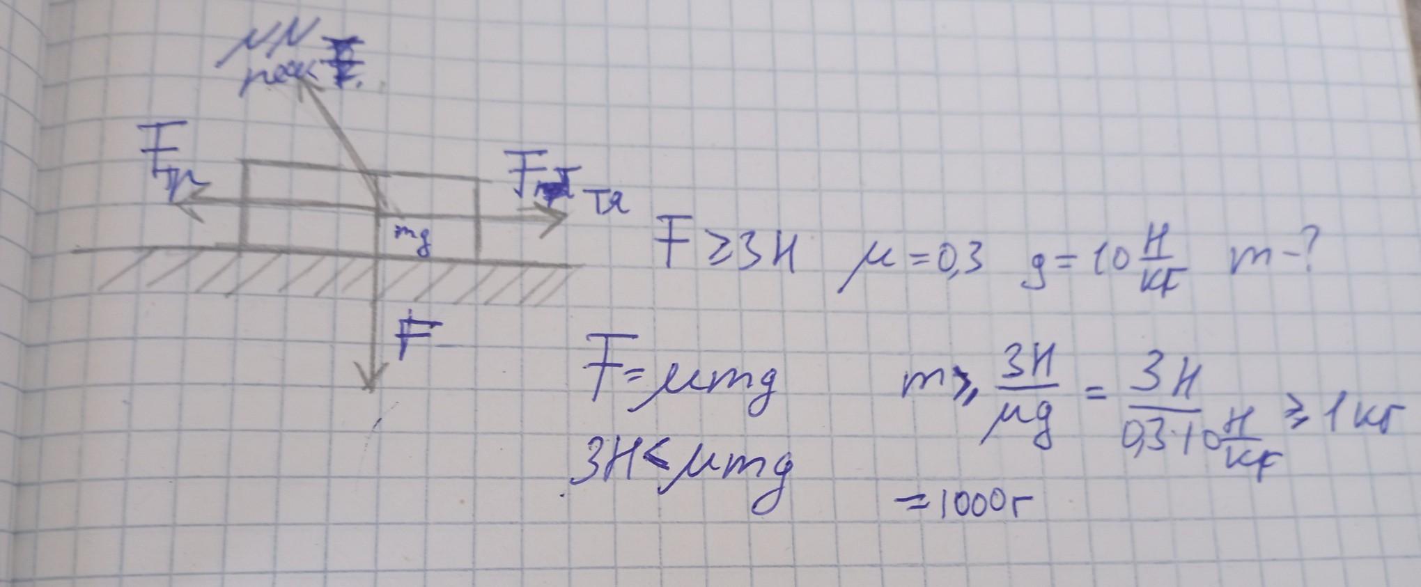 Известно, что книга находится в покое при F⩾3 Н. Коэффициент трения книги об стенку μ=0,3. Определите массу книги. Ответ дайте в г, округлив до целого числа. Ускорение свободного падения g=10 Н/кг.