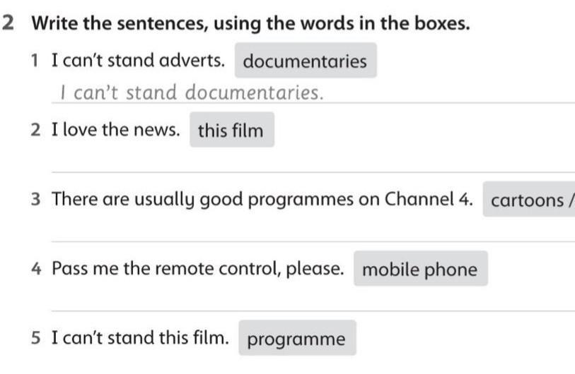 2 Write the sentences, using the words in the boxes. 1 I can't stand adverts. documentaries I can't stand documentaries. 2 I love the news. this film 3 There are usually good programmes on Channel 4. carto 4 Pass me the remote control, please. mobile phone 5 I can't stand this film. programme