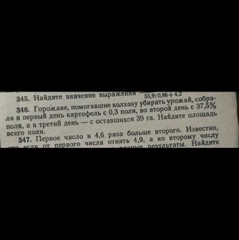 346. Горожане, помогавшие колхозу убирать урожай, собра ли в первый день картофель с 0,3 поля, во второй день с 37,5% поля, а в третий день с оставшихся 39 га. Найдите площадь всего поля