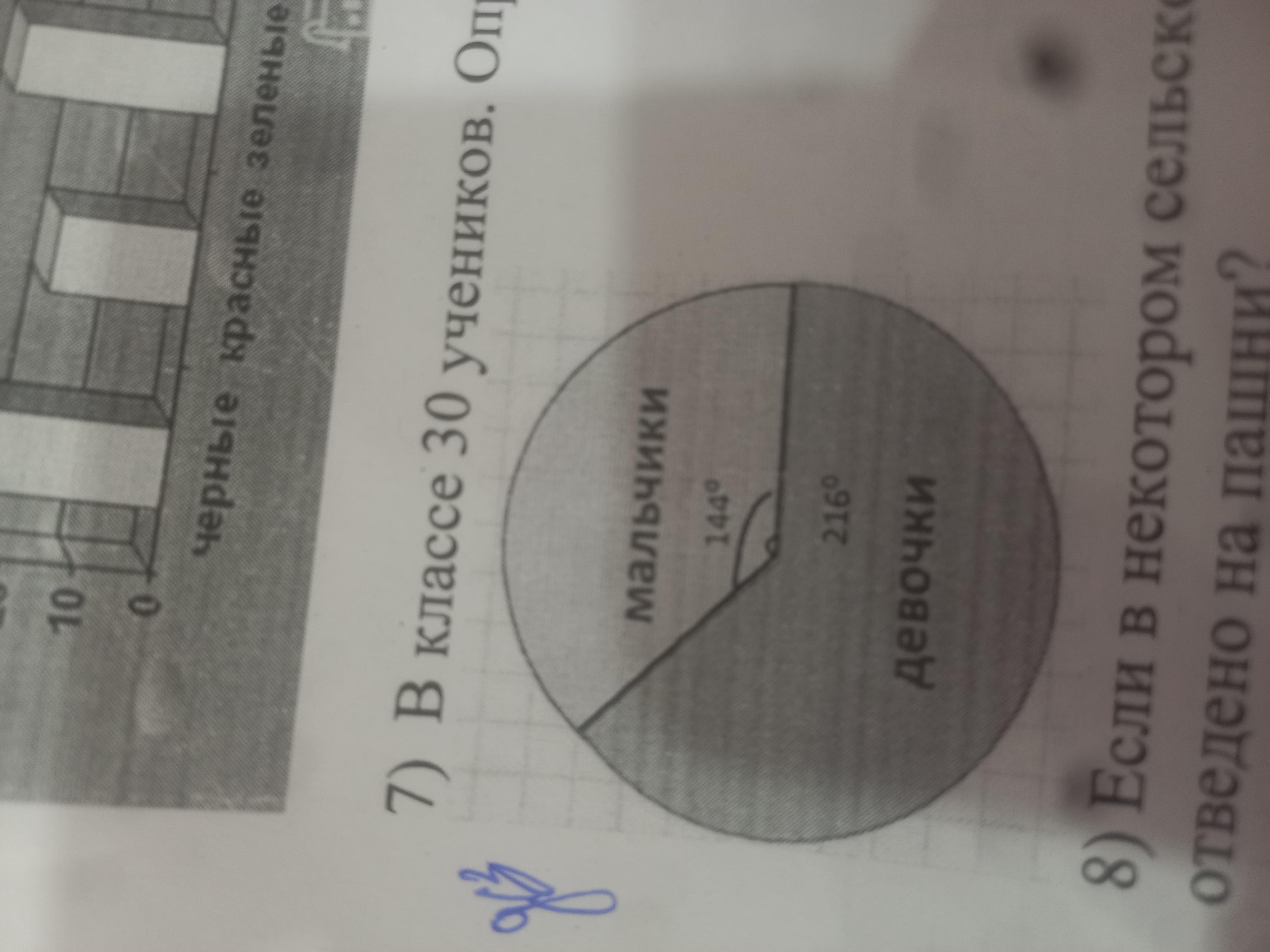 144+216= 360 делим на все количество детей =12 тоисть 1 ребенок=12градусов на схеме теперь 216делим на 12 получаем 18 девочек в класе и 12 мальчиков