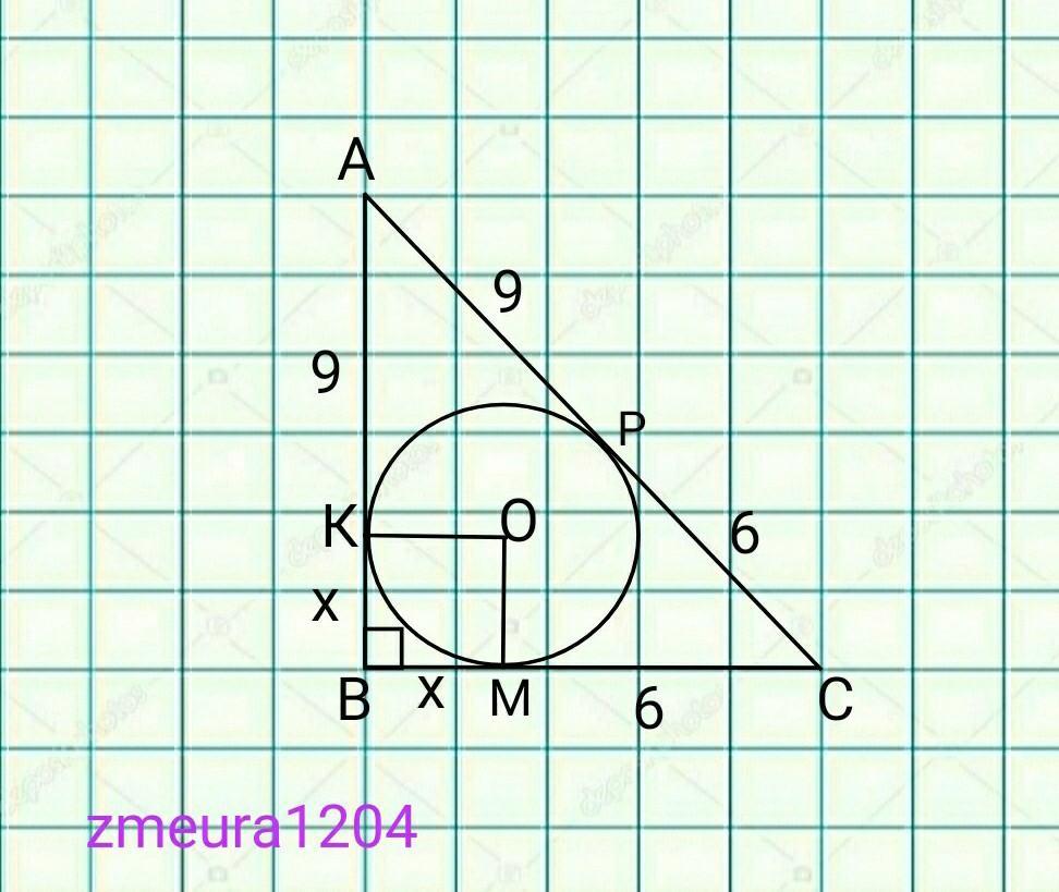 ВМ=ВТ=6 см, АТ=АК=9 см.СК=СМ=х см.; АВ=9+6=15 см.