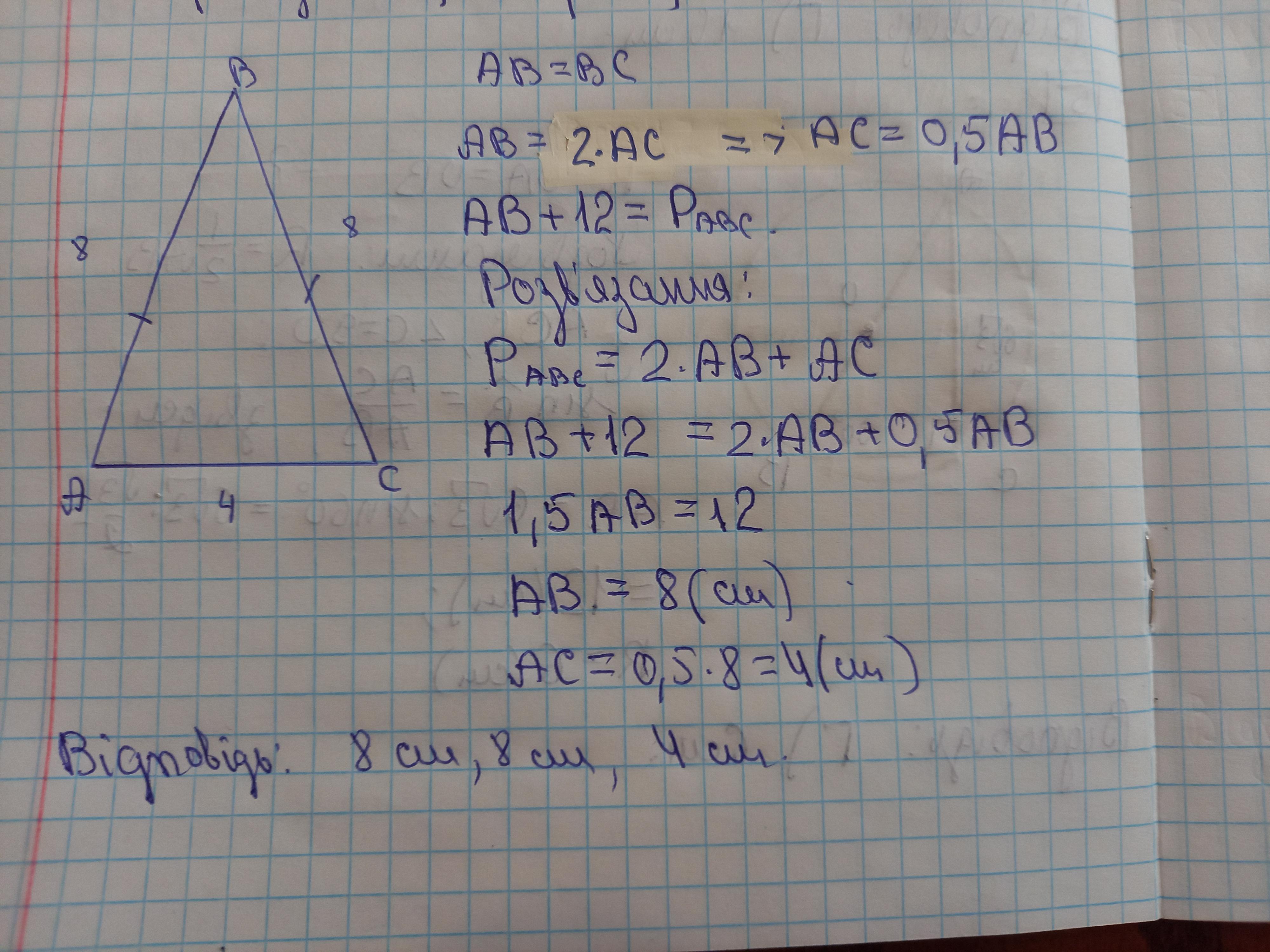 бічна сторона рівнобедреного трикутника вдвічі більша від основи на 12 см і менша від периметра. Знайдіть сторони трикутника