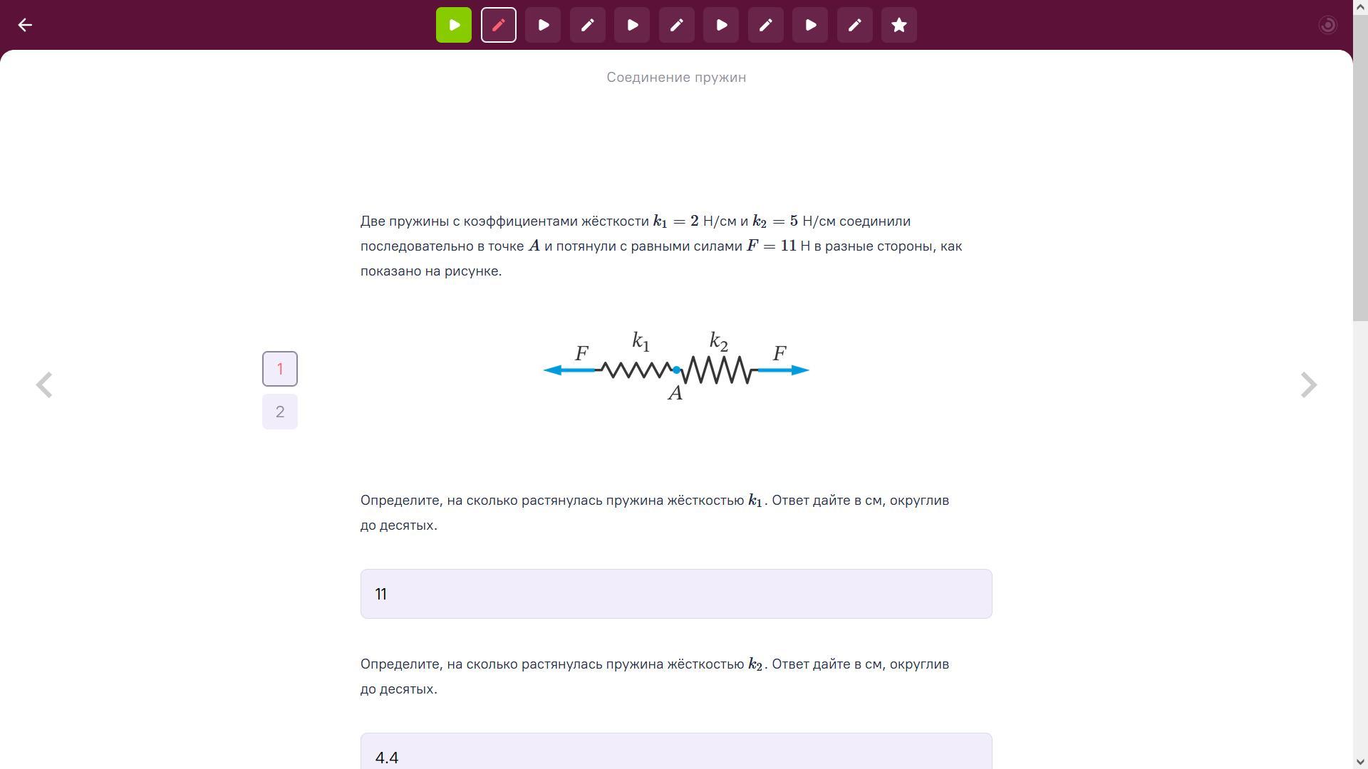 75 баллов! срочно! Две пружины с коэффициентами жёсткости k1=2 Н/см и k2=5 Н/см соединили последовательно в точке A и потянули с равными силами F=11 Н в разные стороны, как показано на рисунке.