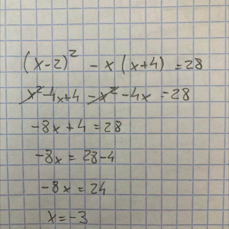 (x-2)^2-x(x+4)=28; Раскрываем скобки.