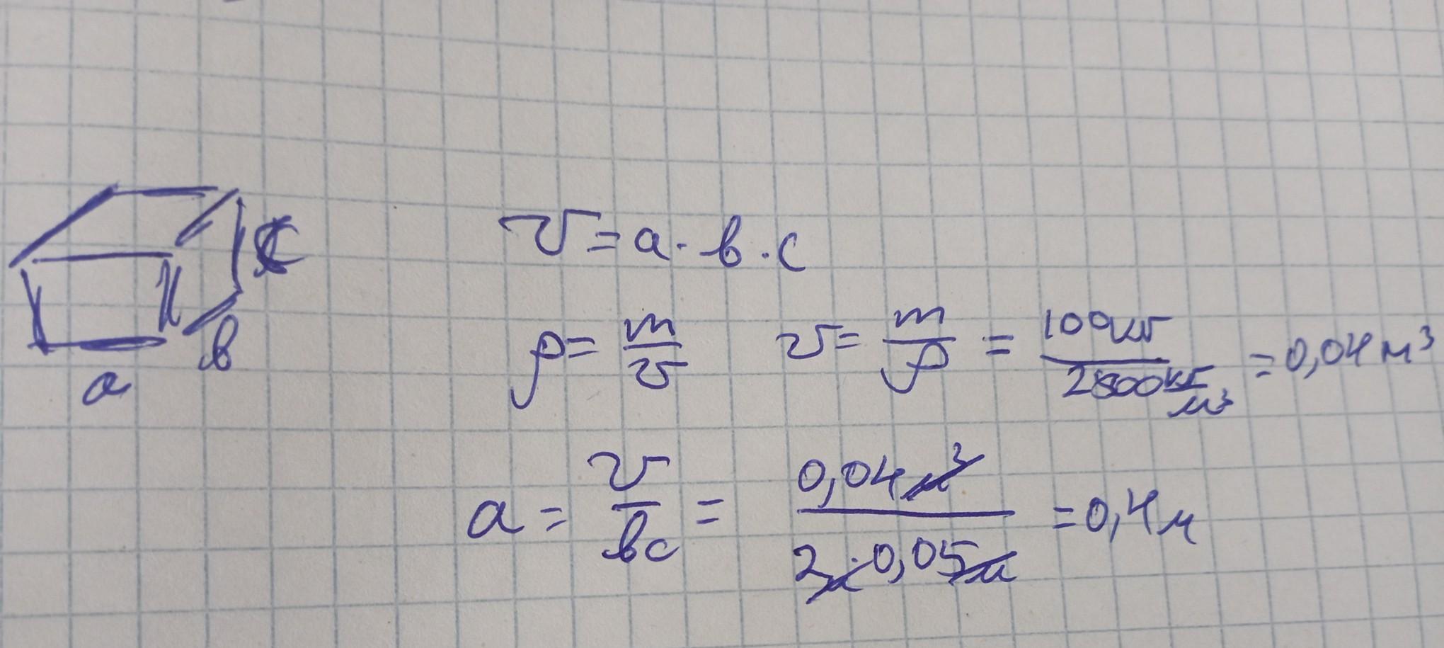 Какой ширины должна быть бетонная стенка высотой 2 метра и толщиной 5 см, чтобы она весила 100 кг ? Плотность бетона принимаем 2500 кг/м3